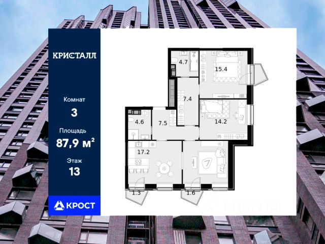 Трёхкомнатная квартира площадью 63,9 кв.м. на 6 этаже дома бизнес-класса "Трилогия Кристалл". Жилой комплекс Трилогия Кристалл комфорт в сердце Хорошево-Мнёвников. Удобное расположение и транспортная доступность. Трилогия Кристалл расположен в престижном районе Хорошево-Мнёвники, на улице Генерала Глаголева, всего в нескольких минутах от живописного Серебряного бора и набережной Москвы-реки. Из окон открываются панорамные виды на воду и зелёные зоны, создавая ощущение гармонии с природой. Автомобильная доступность • Звенигородское шоссе и проспект Маршала Жукова быстрый выезд в любую часть города. • 7 км до ТТК, 9 км до МКАД, 10 км до Садового кольца. • Общественный транспорт: • Ближайшая станция метро "Народное ополчение" (2 км). Добраться можно пешком или на автобусе. • В пешей доступности строятся 3 новые станции метро, что повысит транспортную связанность района. Инфраструктура: всё для жизни в шаговой доступности Комплекс входит в состав масштабного квартала Юнион Парк (40 га) это современная городская среда с продуманной инфраструктурой. Образование и развитие: • Лучшие школы Москвы: 1515, 1517, 138, Курчатовская школа. • Детские сады. • Музыкальная школа им. В. В. Андреева. Медицина и спорт: • Поликлиника "Семейный доктор", медцентр "Мед-Лайт", стоматология. • Спорткомплекс "Серебряный" с бассейном, тренажерным залом и солярием. Магазины и рестораны: • Премиальные магазины: "Азбука вкуса", "ВкусВилл", "Лента", "Магнолия". • Рестораны и кафе. Футуристичная архитектура с продуманным комфортом Трилогия Кристалл это уникальный дизайн и эргономичные планировки: Внешний облик: • Кристаллическая архитектура с панорамными эркерами и фасадами в оттенках горького шоколада. • Трехуровневая структура, где на верхнем ярусе вы увидите геометрические эркеры с панорамным остеклением, на среднем уровне расположены квартиры с окнами на 1-2 стороны, а на нижнем отделка австрийским клинкерным кирпичом. Внутреннее пространство: • Светлые входные группы с лаунж-зонами для отдыха и мероприятий. • Подземный паркинг (по машиноместу на квартиру) и кладовые для хранения. • Закрытые дворы с спортивными зонами: • Теннисный корт. • Площадки для воркаута. • Беговые дорожки. • Поле для игровых видов спорта. Квартиры с продуманными планировками • 14 комнатные варианты. • Высокие потолки и панорамное остекление для максимальной инсоляции. • Ровные стены и черновая/чистовая отделка на выбор. • Готовые решения для комфортного заезда.