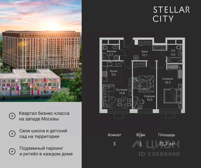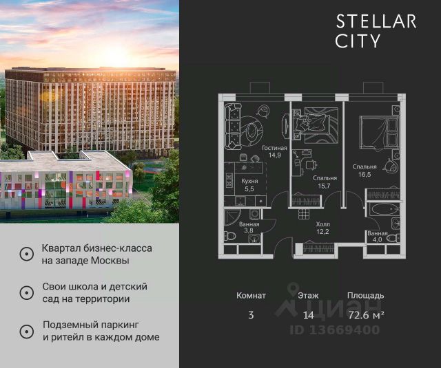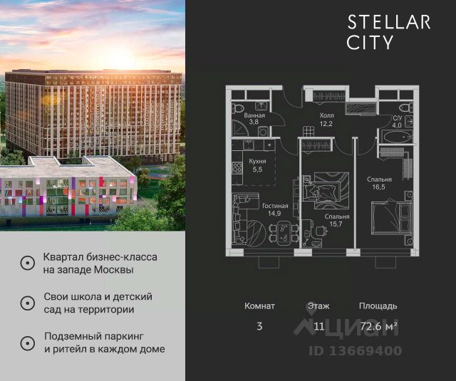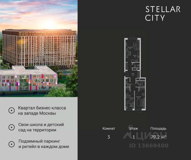 Продается квартира от надежного застройщика Tashir Estate в квартале бизнес-класса Stellar City в ЗАО Москвы. Площадь квартиры составляет: 72.6 кв. м, потолки: 2.9 м Квартира находится на 11 этаже, 4 корпуса жилого квартала Stellar City — микрогорода будущего на орбите Москвы. Stellar City — квартал в ЗАО Москвы вблизи инновационного центра Сколково. В окружении — 11 парков и природных зон, в том числе Долина реки Сетунь, Мещерский лес и парк развлечений The Rink. Город в городе Чтобы дом и инфраструктура вокруг отвечала динамичному лайфстайлу жителя мегаполиса, в основу проекта легла концепция город в городе, которая позволяет решать все бытовые вопросы in-home. В квартале будут возведены школа и детский сад, воркаут-зоны, променад, вело и беговые дорожки, детские площадки для каждого корпуса, а также коммерция на первых этажах для ежедневных покупок. Все необходимое — на расстоянии нескольких шагов. Изящные и лаконичные лобби Авторский дизайн, натуральные материалы в отделке и безупречный интерьер вне времени. Лобби и холлы в проекте бизнес-класса Stellar City ничем не отличаются от входных групп в премиум-сегменте благодаря качественным европейским материалам в отделке, стильному дизайну, консьерж-сервису и уютной зоне ожидания с журнальными столиками и мягкой мебелью. Комфорт и безопасность Закрытая территория, охрана, система СКУД, специально разработанное мобильное приложение дома для резидентов и подземный паркинг с круглосуточным наблюдением и доступом с помощью автоматического считывания номера авто. 3-комнатная квартира рядом с метро Сколково.