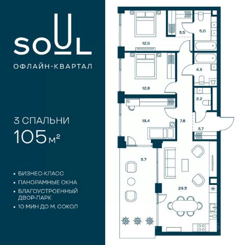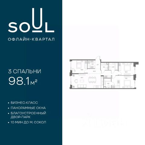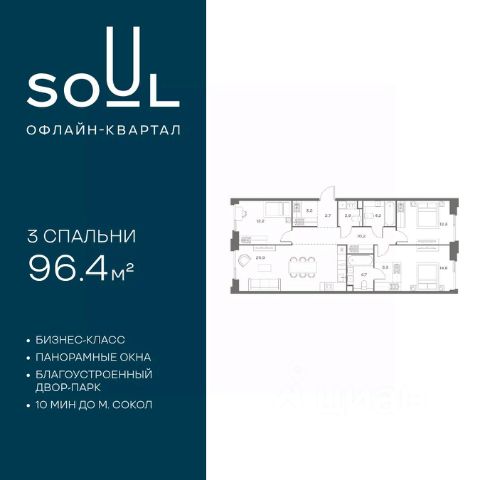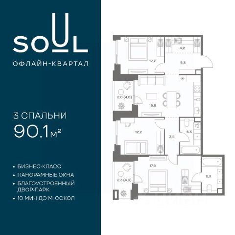 Цены указаны с условием 100% оплаты и стандартной ипотеки. Прямая продажа от застройщика! Продается 3-к. квартира номер 433 общей площадью 90.8 кв.м. на 8-м этаже 18 этажного дома, Корпус 8. Без отделки. Проект бизнес-класса SOUL от девелопера FORMA. До метро Сокол 10 мин пешком. Архитектура от британского бюро SimpsonHaugh. Благоустройство дворов — Gillespies и GAFA. Территория состоит из культурного парка и приватных дворов. Озеленение в эстетике лесного оазиса. Насыщенное благоустройство: прогулочные тропинки, релакс-зоны, пряный и сенсорный сады, развивающие детские площадки и воркауты. В центре проекта объект культурного наследия — общественное пространство Изофабрика, построенная в 30-х годах по проекту архитектора Георгия Гольца. Здесь будут располагаться мастерские для взрослых и детей, выставочные залы, коворкинги, образовательный центр, рестораны и кафе. Квартиры с панорамными окнами, мастер-спальнями, гардеробными, классическими балконами и лоджиями, видовыми террасами. Высота потолков от 2,9 до 3,5 м. В проекте 2 детских сада на 100 и 200 малышей. Клубная гостиная, фитнес-рум, детская игровая комната, дизайнерские лобби, подземный паркинг и келлеры. 3-комнатная квартира рядом с метро Сокол.