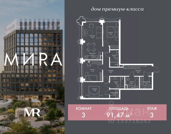 Прямая продажа от застройщика. Продаётся 3-комнатная квартира общей площадью 91.47 м² без отделки в доме премиум-класса МИRА на 3-м этаже 17 этажного дома. Квартира расположена в корпусе 1. Дом премиум-класса МИRA это: • Спокойный район с богатой историей и сложившейся инфраструктурой • Авторская архитектура на стыке классики и современности • Вход в парк прямо из жилого комплекса • Панорамные виды на Яузу, парки, ВДНХ и скульптуру "Рабочий и колхозница" • Удобные сервисы и безопасность для каждого резидента Расположение: Жилой квартал расположен в Алексеевском районе на северо-востоке Москвы, на второй линии домов, таким образом вы сможете дистанцироваться от шума и суеты проспекта Мира, но при этом будете жить недалеко от этой важной городской магистрали. Прямо у дома: • Парк Акведук • Река Яуза • Памятник "Рабочий и колхозница" Пешком: • 16 мин м. ВДНХ На автомобиле: • 12 мин ТТК • 15 мин Садовое кольцо • 12 мин Национальный парк "Лосиный остров" Благоустройство: Концепция благоустройства от бюро "ДРУЖБА" разработана в стиле "Лесная тропа". В уютном дворе расположились словно затерянные в лесу, площадки для отдыха. Они разделяются островками с травами, кустарниками, крупными камнями и деревьями, между которыми проходят узкие песчаные тропинки с деликатной подсветкой по вечерам. Центральной точкой притяжения для жителей станет главная площадь с фонтаном, которая открывается сразу из двух входных групп. Внутренний двор МИRA: • Детская площадка с зонами для игр малышей до трех лет и детей более старшего возраста • Спортивная площадка с профессиональным оборудованием для тренировок • Декоративные перголы • Воздушный арт-объект с подсветкой, похожий на облако • Чайный домик, где в отдельном отапливаемом павильоне можно в любое время года попить кофе с соседями или устроить камерное семейное чаепитие • Зоны для работы и отдыха с гамаком под навесом, скамейками и креслами Инфраструктура и окружение: В Алексеевском районе есть огромные благоустроенные парки, магазины, гимназии с высоким рейтингом и филиалы ВУЗов, частные и государственные детские сады, модные кофейни и фитнес-центры. В квартале МИRА предусмотрены: • 2 ресторана с видом на парк Акведук • 3 кафе • фитнес-студия • подземный паркинг на 330 машино-мест Компания MR предлагает своим клиентам специальные условия приобретения квартир в рамках программ ипотечного кредитования от банков-партнеров. Продам 3-комнатную квартиру рядом с метро ВДНХ.