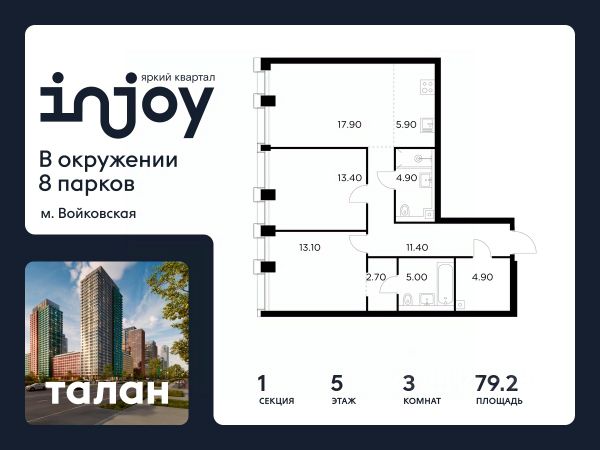 Прямая продажа от застройщика. В жилом квартале, расположенном в Войковском районе Москвы, продаётся 3-комнатная квартира площадью 67 кв.м без отделки. Квартира расположена на 4 этаже 35-этажного дома, корпус 1, в жилом квартале бизнес-класса INJOY. INJOY отделен от Ленинградского шоссе исторической застройкой и расположен всего в одном километре от магистрали: это возможность быстро добраться до центра или в любой район города по МКАДу или ТТК. Для автомобилей в INJOY — удобный подземный паркинг с доступом на лифте. Здесь же расположены кладовые площадью от 2,1 до 9 кв. м. Усилители сотового сигнала в лифтах и паркинге позволяют вести важные разговоры, не прерываясь на полуслове. Десятки мест отдыха вокруг INJOY дарят детям и взрослым запоминающиеся развлечения в любую погоду: от прогулок по паркам и природным зонам до интересного досуга в кругу семьи или друзей. 10 минут до парка Покровское-Стрешнево 12 минут до усадьбы Михалково 15 минут до Химкинского водохранилища 7 минут до ТРЦ "Метрополис" INJOY расположен в развитом сформировавшемся районе, что обеспечивает жителям обширную инфраструктуру в пешей доступности. МЦК "Балтийская" - 200 м Ленинградское шоссе - 1 км м. Войковская - 1 км ТТК - 7 км В проекте INJOY три очереди, разновидность которых формирует силуэт живого мегаполиса. Архитекторы международного бюро AI Studio придали индивидуальность каждому корпусу, чтобы все уголки INJOY обрели особенный характер. Планировки и форматы квартир уникальны: пентхаусы, квартиры с террасами, мастер-спальнями, выходом на променад, угловым остеклением, лоджиями, гардеробными, кладовыми и постирочными. Внутренний двор INJOY продолжает общую концепцию благоустройства и включает в себя: три детские площадки для разных возрастов, зону work-out, природную озеленённую зону, променад с зонами для релакса, йоги и амфитеатром с арт-объектами. Закрытый двор, видеонаблюдение и контроль доступа обеспечивают безопасность каждому жителю комплекса. Стоимость квартиры - 27926400 Р. Срок сдачи - 1 квартал 2027. Более подробную информацию по объекту уточняйте по телефону и в отделе продаж. 3-комнатная квартира рядом с метро Войковская.