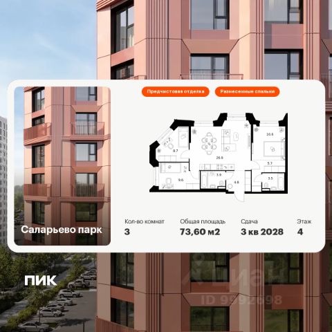 Продаётся 3-комн. квартира площадью 72,2 кв.м на 7 этаже 24 этажного дома (Корпус 82.4, Секция 4) проекта ПИК Саларьево парк. Светлый просторный подъезд на уровне земли, функциональная планировка, большие окна, предчистовая отделка. Жилой район "Саларьево парк" расположен в Новой Москве, в четырёх километрах от МКАД по Киевскому шоссе. Две станции метро: "Саларьево" и "Филатов луг", — находятся в пешей доступности от проекта. Дойти до них можно за 510 минут. В квартале уже создана качественная среда, где есть абсолютно всё для полноценной жизни, работы и отдыха. Благодаря удобному расположению проекта всё важное будет рядом: детские сады, школы, кафе и рестораны, шопинг в торговых центрах, фитнес и даже аэропорт. Все корпуса в квартале гармонично сочетаются, образуя единую городскую среду. Между собой их объединяет невысокая этажность и натуральная цветовая гамма. Здесь приятно гулять и проводить время на улице всей семьёй. В "Саларьево парке" создана уникальная образовательная среда, включающая в себя шесть школ, рассчитанных на 6 250 учеников. Две из них уже открыты, их посещает 2 300 детей. Также на территории "Саларьево парка" находится 12 детских садов, один из которых с бассейном. Сейчас уже открыты 7 садов. В "Саларьево парке" открыта уникальная игровая площадка — PlayHub "Оригами". Здесь есть ручей, горка-труба и рельефные холмы. Взрослые смогут отдохнуть в уютном кафе, пока дети играют. Также на территории проекта есть SportHub — большая спортивная зона, разделённая по интересам и возрастам. Здесь можно заниматься разными видами спорта: футболом, баскетболом, волейболом и стритболом. Зимой центральную часть площадки превращают в каток. Во дворах-парках жилого квартала есть места для отдыха, детские и спортивные площадки. На первых этажах домов расположены магазины, кафе и полезные сервисы. Также вблизи проекта есть несколько масштабных торговых центров. До ТЦ "Саларис" пять минут пешком, до "Рио", Metro Cash & Carry и "Леруа Мерлен" — пять минут на автомобиле. Артикул 1032578 (Застройщик ООО "Специализированный Застройщик "Тирон") Купить 3-комнатную квартиру в поселении Московский в Москве.