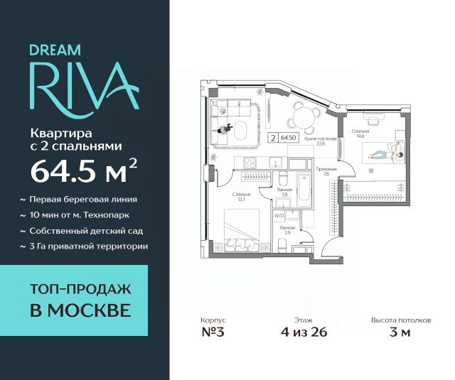 Увеличенный объем панорамного остекления создает неповторимое ощущения воздушности пространства! Двор-набережная с видами на гладь реки и кроны деревьев. Премиальный квартал DREAM RIVA — авторская архитектура в курортной концепции, воплощающей силу природных стихий в каждой детали оформления и благоустройства. Продаётся Квартира с 2 спальнями квартира на 25 этаже 27-этажного дома (2 корпус). Общая площадь: 79.7 кв.м. Высота потолков от 3 м. Формат приватного досуга и эксклюзивные привилегии в DREAM RIVA с приоритетным доступом для резидентов: - Первая линия Москвы-реки с открытыми видами на воду и город; - 3 Га приватного прибрежного парка с зонами для спорта и йоги; - Открытый солярий; - Школа и собственный детский сад; - Многофункциональные детские игровые площадки и детское кафе с игровой комнатой; - Клубная гостиная и lounge-бар. Локация вне конкуренции — инфраструктура полуострова предлагает всё, что нужно для размеренной жизни, работы, отдыха и развлечений: - Благоустроенная набережная с гастрогалереей; - Парк аттракционов Остров Мечты (в торговой части: рестораны, кафе, супермаркет, магазины, салон красоты, йога-студия и многое другое); - 44 Га ландшафтных парков для прогулок, спорта, пикников; - Пляжный комплекс Dream Beach Club со множеством бассейнов, ресторанов, баров и развлечений для любого возраста; - Яхт-клуб; - Вейк-парк; - Кинотеатр под открытым небом и многое другое. Удобная транспортная доступность: - Центр рядом: 15 минут до Садового кольца на авто, 20 минут до Сити или Кремля; - В 5 минутах прогулочным шагом — станция метро "Технопарк"; - Южный речной вокзал. Наши менеджеры будут рады провести для Вас консультацию и подробнее рассказать о проекте. Успейте купить на лучших условиях! Продается 3-комнатная квартира в районе Нагатинский затон в Москве.