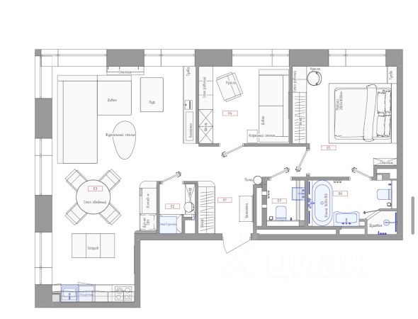 В конце фотоленты помещены планировочные решения и изображение, созданное ИИ как пример возможного дизайна интерьера квартиры с отделкой.