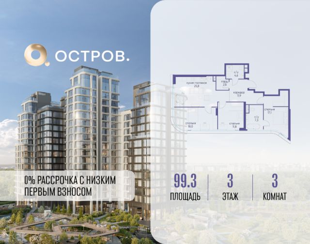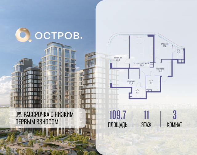 Продаётся 3-комн. квартира от застройщика: общая площадь 126.50 м², жилая 41.10 м², кухня 38.80 м², 4-й этаж, жилой квартал "Остров 12", корпус 6 (секция 1). Срок сдачи: 1 квартал 2029 года. 3 совмещенных санузла. В жилой зоне 2 больших окна на одну сторону, хорошая инсоляция. Позвоните сейчас и забронируйте квартиру! ОСТРОВ от Донстрой - жилой комплекс на западе Москвы, в Мневниковской пойме. Уникальное преимущество комплекса - в том, что он обособлен от города рекой и природным парком (650 га). Благодаря природному окружению эта территория имеет лучший экологический рейтинг в столице. Кварталы ОСТРОВА объединены ландшафтным дизайном в единое пространство - с набережными и Центральным бульваром. На ОСТРОВЕ любые объекты, необходимые для полноценной жизни и отдыха, находятся на расстоянии 15-минутной прогулки. Торговый центр и супермаркеты, кафе и рестораны, фитнес, салоны красоты, школы и детские сады. А также крупнейший в Москве спортивный кластер.