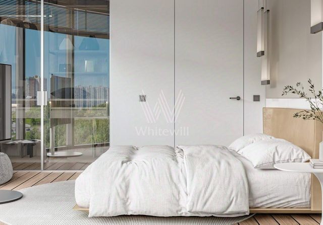 Вашему вниманию предлагается эксклюзивная видовая трехкомнатная квартира с отделкой в стиле Темная классика общей площадью 128,2 кв.м. Квартира расположена на 6 этаже в корпусе 5, классе Advanced, секции 2 в уникальном ЖК СберСити в Рублево-Архангельском. Планировка: мастер-спальня 17,7 кв.м, жилая комната 14,3 кв.м, жилая комната 14,4 кв.м, кухня-столовая 44,7 кв.м, коридор 9,4 кв.м, прихожая 3,7 кв.м, санузел 6,4 кв.м, мастер-санузел 4,0 кв.м, гардеробная 4,8 кв.м, постирочная 2,4 кв.м, балкон 1,8 кв.м ( с коэф. 0,3). Ключевые преимущества: - в доме всего 69 квартир; - первая линия от воды; - шикарный панорамный вид на воду из окон кухни-столовой; - авторский ремонт в стиле Темная классика (интегрирован Умный дом, климат- контроль, полностью оборудован санузел, теплый пол); - высота потолков 3 метра. Инфраструктура: метро Рублево-Архангельское (2027 год); сильный образовательный кластер: 8 школ, 16 детских садов, Школа 21 и филиал ведущего Вуза; современный офисный квартал во главе с партнерскими компаниями Сбера; зеленые парковые зоны; набережная вдоль озера, яхтенная марина. О квартале: роскошная архитектура от итальянского бюро, в каждом доме коворкинг, летняя терраса с потрясающим видом на воду, велопарковки, лапомойки, подземный паркинг с зарядками для автомобилей.