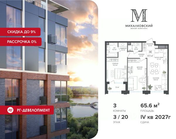 При приобретении квартиры доступна беспроцентная рассрочка с первым платежом от 30%. У покупателя также есть право воспользоваться скидкой в размере 5% от полной стоимости квартиры. - Первый платеж составляет 30% от стоимости объекта и вносится при заключении ДДУ - Второй платеж в размере 30% от стоимости объекта вносится через 6 месяцев с даты заключения ДДУ - Остаток 20% через 12 месяцев с даты заключения ДДУ, но не позднее 30.06.2027 - Остаток 20% не позднее 30.06.2027 - Действует на приобретение квартир в корп. 2, 7 Продаётся 3-к квартира 63,8 кв.м. в ЖК "Михалковский" на 10-м этаже 18 этажного дома. Скидка 9% при покупке квартиры! Ипотека для каждого! Полная стоимость кредита от 12,380% до 18,537%. Ставка от 0,11% в АО "Альфа-Банк", ген. лицензия ЦБ РФ 1326 от 16.01.2015. Ставка фиксируется на первые 12 месяцев, далее полная стоимость кредита от 22,022% до 24,599% ставка 21,59%. Первоначальный взнос — от 20,1% от стоимости квартиры. Срок кредитования — от 4 до 30 лет. Компания "РГ-Девелопмент" предоставляет скидку на квартиры в жилом комплексе. Акция действительна до 15.05.2026 включительно. Для того чтобы воспользоваться предложением, необходимо подписать договор на приобретение недвижимости до 15.05.2026 включительно. Действует программа "Растет семья - растет и квартира". Компания "РГ-Девелопмент" вошла в ТОП-10 девелоперов по объёму введённого жилья в "Старой Москве" по итогам 2025 года. Прямая продажа от застройщика! Квартиры без отделки. Срок сдачи IV кв. 2027г. Особенности проекта: Завораживающие виды Красивое благоустройство Уникальная локация для Москвы (рядом Головинский парк, пруды, усадьба Михалково) Рядом с центром В проекте присутствует: архитектура голландского бюро MLA+, зеленые зоны, транспортная доступность, благоустроенная территория, подземный паркинг, детский сад и выход на Головинский парк с пятью прудами. Название комплекса указывает на одну из его черт - соседство с имением Михалково. Позвольте себе жить в месте, где проводили свой досуг династии Дашковых и Паниных.