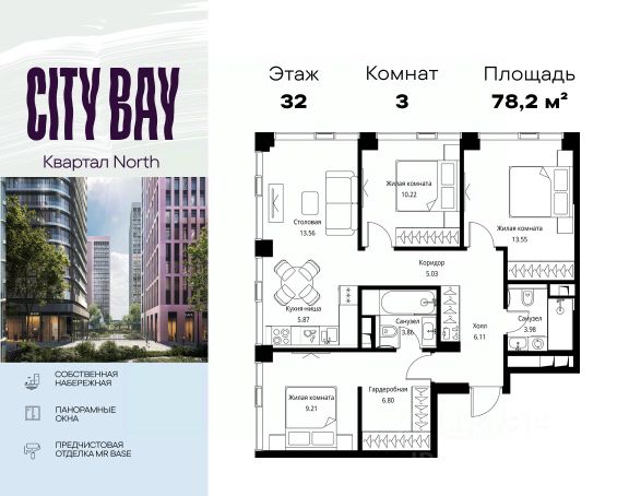 Прямая продажа от застройщика. Продаётся 3-комнатная квартира общей площадью 83.64 м² с предчистовой отделкой в ЖК City Вау, квартале North, на 24-м этаже 27 этажного дома. Концепция жилого комплекса City Вау - настоящий город в городе с отлично развитой инфраструктурой и собственной благоустроенной набережной. На территории жилого комплекса расположено пять кварталов - Atlantic, Pacific, Indian, North, Cliff. Жилой квартал City Вау отличается оригинальной концепцией и выделяется среди других проектов такими характеристиками как: - Архитектура, - Виды из окон, - Природное окружение, вызывая гордость у жителей и восхищение у прохожих. Вся жизнь района Покровское-Стрешнево строится вокруг водных объектов: - Пойма реки Сходни с уникальной экосистемой, - Речка Химка и Химкинское водохранилище, - Москва-река, - Канал имени Москвы. Кругом вода, и местные с удовольствием этим пользуются. А сразу за рекой - центр водного спорта в Строгино с вейк-парком и яхт-клубами. Помимо воды, здесь очень много зелени: - Рядом Сходненский ковш памятник природы, естественный амфитеатр глубиной 40 метров; - Парк при усадьбе Братцево с фруктовым садом; - Дубовая роща "Маяк", - Алешкинский лес; - Лесопарк Покровское-Стрешнево с пляжами и бобрами. Главные транспортные артерии района: - Волоколамское шоссе, - Таганско-Краснопресненская линия метро и МЦД-2. Всего за 20 минут можно добраться до центра на машине или метро, а МЦД связывает ЖК City Вау с северными, восточными и юго-восточными районами. Компания MR предлагает своим клиентам специальные условия приобретения квартир в рамках программ ипотечного кредитования от банков-партнеров.