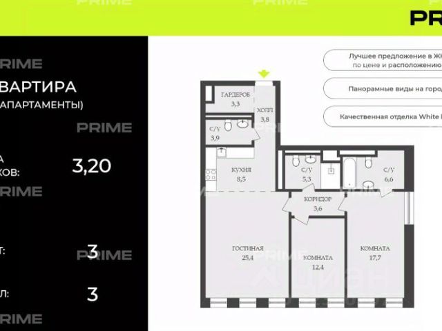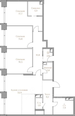 • Большая мастер-спальня (более 20 кв. м) с двумя панорамными окнами, вместительными нишами для хранения вещей и личным санузлом