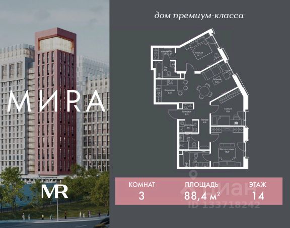 Прямая продажа от застройщика. Продаётся 3-комнатная квартира общей площадью 83.11 м² без отделки в доме премиум-класса МИRА на 3-м этаже 17 этажного дома. Квартира расположена в корпусе 1. Дом премиум-класса МИRA это: • Спокойный район с богатой историей и сложившейся инфраструктурой • Авторская архитектура на стыке классики и современности • Вход в парк прямо из жилого комплекса • Панорамные виды на Яузу, парки, ВДНХ и скульптуру "Рабочий и колхозница" • Удобные сервисы и безопасность для каждого резидента Расположение: Жилой квартал расположен в Алексеевском районе на северо-востоке Москвы, на второй линии домов, таким образом вы сможете дистанцироваться от шума и суеты проспекта Мира, но при этом будете жить недалеко от этой важной городской магистрали. Прямо у дома: • Парк Акведук • Река Яуза • Памятник "Рабочий и колхозница" Пешком: • 16 мин м. ВДНХ На автомобиле: • 12 мин ТТК • 15 мин Садовое кольцо • 12 мин Национальный парк "Лосиный остров" Благоустройство: Концепция благоустройства от бюро "ДРУЖБА" разработана в стиле "Лесная тропа". В уютном дворе расположились словно затерянные в лесу, площадки для отдыха. Они разделяются островками с травами, кустарниками, крупными камнями и деревьями, между которыми проходят узкие песчаные тропинки с деликатной подсветкой по вечерам. Центральной точкой притяжения для жителей станет главная площадь с фонтаном, которая открывается сразу из двух входных групп. Внутренний двор МИRA: • Детская площадка с зонами для игр малышей до трех лет и детей более старшего возраста • Спортивная площадка с профессиональным оборудованием для тренировок • Декоративные перголы • Воздушный арт-объект с подсветкой, похожий на облако • Чайный домик, где в отдельном отапливаемом павильоне можно в любое время года попить кофе с соседями или устроить камерное семейное чаепитие • Зоны для работы и отдыха с гамаком под навесом, скамейками и креслами Инфраструктура и окружение: В Алексеевском районе есть огромные благоустроенные парки, магазины, гимназии с высоким рейтингом и филиалы ВУЗов, частные и государственные детские сады, модные кофейни и фитнес-центры. В квартале МИRА предусмотрены: • 2 ресторана с видом на парк Акведук • 3 кафе • фитнес-студия • подземный паркинг на 330 машино-мест Компания MR предлагает своим клиентам специальные условия приобретения квартир в рамках программ ипотечного кредитования от банков-партнеров. Купить 3-комнатную квартиру станция Ростокино (МЦК).