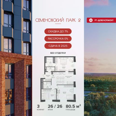 Ипотека для каждого! Полная стоимость кредита от 11,578% до 22,490%. Ставка от 0,11% в АО "Альфа-Банк" фиксируется на 1 год с даты заключения кредитного договора, далее полная стоимость кредита от 25,819% до 28,767% ставка 21,59% до окончания срока кредитования. Первоначальный взнос — от 20% от стоимости квартиры. Срок кредитования — от 3 до 30 лет. Ипотека на весь срок! Полная стоимость кредита от 23,396% до 26,058% со ставкой 14,5%! Первоначальный взнос —от 20,01% от стоимости квартиры. Срок кредитования — от 3 до 30 лет. АО "Банк ДОМ.РФ" универсальная лицензия Банка России 2312 от 19.12.2018. Скидка 7% при покупке квартиры! Цена указана с учетом максимального размера скидки. Продается 3-к квартира 80,5 кв.м. в ЖК "Семеновский парк 2" на 16-м этаже 26 этажного дома. Компания "РГ-Девелопмент" предоставляет скидки на квартиры в жилом комплексе. Акция действительна с 12.09.24 г. до 30.11.25г. включительно. Чтобы воспользоваться предложением, необходимо подписать договор на приобретение недвижимости до 30.11.25г., включительно. Скидка 5% + Рассрочка 0% При приобретении дольщиком квартиры с использованием способа оплаты "Рассрочка 0%", у покупателя также есть право воспользоваться скидкой в размере 5% от полной стоимости квартиры. Условия программы рассрочки: - Первый платеж составляет 20% от стоимости объекта и вносится при заключении ДДУ. - Оставшаяся сумма выплачивается за месяц до планового срока ввода ЖК в эксплуатацию, то есть не позднее 30.11.2025. Прямая продажа от застройщика! Квартиры без отделки. Срок сдачи корпуса - 4 кв. 2025 г. ЖК "Семеновский парк 2" - это идеальное место для того, чтобы стать вашим домом. Проект расположен в исторической части Москвы вблизи Измайловского лесопарка, в 1 км от ЦАО. 4 станции метро отделяют вас от Красной площади и 15 минут на автомобиле - от Садового кольца. Купить 3-комнатную квартиру станция Соколиная гора (МЦК).
