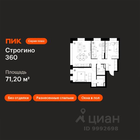 Новостройка! Продается 3-комн. кв-ра площадью 73,6 кв.м, (Корпус 1.1.2, Секция 2) 3 этаж 10-этажного дома в Строгино 360 от ПИК. Проект, где каждый день будет наполнен гармонией и новыми возможностями, где можно найти идеальный баланс между энергией большого города и спокойствием природного окружения. Это настоящая экосистема в окружении четырех парков и набережной Москвы-реки, где современная архитектура, умные технологии и продуманная среда создают новое качество жизни. Здесь дом — не точка на карте, а пространство состояния: покоя, сосредоточенности, внутренней свободы.Ты всё ещё в городе. Но ты уже в стороне от его суеты. Мы создаем многофункциональный район с уникальной идентичностью, интегрированный в городскую ткань Москвы. Ключевой принцип — комплексное развитие территории, учитывающее потребности всех групп пользователей: от жителей и бизнеса до гостей города. Проект максимально раскрывает потенциал места за счет синтеза современной архитектуры, динамичной деловой среды и уникального природного ландшафта — акватории Москвы-реки и зеленых массивов. "Строгино 360" — больше чем жилой квартал. Здесь создана вся необходимая инфраструктура для комфортной и насыщенной жизни. Главной артерией станет пешеходный бульвар длиной 3,4 км с магазинами, кафе и зонами отдыха. Для детей построены современные детские сады и школы с классами и лабораториями от "Ростеха" и с программами, созданными при участии МФТИ. Любителей активного образа жизни ждут спортивный центр, зоны воркаута, памп-трек и водные виды спорта на Строгинском затоне. А в деловом кластере можно работать рядом с домом. #d04.12# Артикул 1050832 Продается 3-комнатная квартира в районе Строгино в Москве.