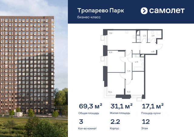 Строим кварталы для жизни с заботой о будущем. Предлагаются 3-комнатные апартаменты бизнес-класса 69,27 кв.м в корпусе 2.2 на 12 этаже, в МФК "Тропарево Парк" Апартаменты с чистовой отделкой. Доступность дополнительных опций уточняйте у застройщика. Прописка не предусмотрена в рамках юридического статуса - апартаменты. Приобрести апартаменты возможно по специальным акциям от застройщика, с текущими условиями акций можно ознакомиться в блоке "Акций". Цена динамическая и может отличаться, уточняйте актуальность у застройщика. "Тропарево Парк" — комплекс апартаментов бизнес-класса рядом с Ленинским проспектом, в Новой Москве. Находится всего в 10 минутах пешком от станции метро "Румянцево". Включает 7 жилых корпусов высотой от 16 до 23 этажей, приватные дворы-сады, обширную зеленую территорию с общественными пространствами. Из части апартаментов открываются виды на Тропаревский лесопарк, расположенный рядом.