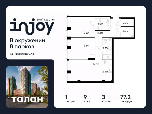 Цена указана с учётом скидки при 100%-й оплате, несубсидированной ипотеке, рассрочке (кроме программы "Рассрочка 0%"). Продается 3-комнатная квартира площадью 92.50 кв. м без отделки. Квартира находится на 3 этаже 20-этажного корпуса 3, в новом жилом комплексе бизнес-класса Level Войковская, расположенном рядом с живописным заповедником "Покровское-Стрешнево" (застройщик - компания Level Group/Левел групп). Прекрасная транспортная доступность - 7 мин. пешком до станции МЦК "Балтийская"; - 15 мин. пешком до станции метро "Войковская"; - 8 мин. на машине до ТТК; - 15 мин. на машине до центра Москвы; - 20 мин. на машине до Москва-Сити. Продуманный архитектурный проект - стильная архитектура от мастерской Фефелова В. В.; - панорамные виды на парки, Химкинское водохранилище и Останкинскую башню; - лобби с высотой потолков до 6,45 метров; - более 20 видов планировочных решений, включая редкие форматы квартир с террасой и увеличенной высотой потолков до 5,42 метров; - 2 варианта дизайнерской отделки в корпусе 4, предлагаются как дополнительная опция к отделке white box: стиль Modern в светлых холодных тонах и стиль Classic в нейтральной бежевой гамме. Квартиры в корпусах 3 и 5 сдаются без отделки. Расположение Level Войковская строится в престижном Северном округе Москвы. Развитая инфраструктура и живописная природа переплетаются в единый ансамбль, столь значимый для комфортной жизни. Войковский район окружают парки и набережные. В шаговой доступности - парк "Покровское-Стрешнево", не более 15-ти минут на велосипеде занимает путь до Тимирязевского парка и 9-ти минут до парка усадьбы Михалково. Рядом более 60 школ, 75 дошкольных учреждений, 17 государственных и 6 частных вузов, 25 супермаркетов, 4 торговых центра, среди которых ТЦ "Метрополис" и ТЦ "Авиапарк". Внутренняя инфраструктура На территории жилого комплекса предусмотрены коммерческие помещения: кафе, ресторан, пекарня и другие сервисы откроются на первых этажах корпусов. Для жителей будет доступен отапливаемый подземный паркинг на 244 машино-места с доступом с любого этажа на лифте. На территории паркинга будет расположено 125 кладовых помещений для хранения сезонного инвентаря. Лобби и благоустройство Дизайн лобби Level Войковская создан совместно с бюро BLANK. Это уютные гостиные, где хочется задержаться. Теплая цветовая гамма, ресепшен, зоны ожидания, лапомойки и гостевые санузлы - каждая деталь превращает лобби в комфортное продолжение вашего дома. 1,15 га площади в первых двух этапах строительства отведено под приватный внутренний двор, который спроектирован совместно с бюро "Правда". Детские площадки для всех возрастов, спортивные пространства для йоги, воркаута и петанка, уютные зоны для тихого отдыха или работы. Здесь утро начинается с вдохновения, а вечер наполнен приятными моментами. Лифты Комфортное перемещение внутри жилого комплекса будут обеспечивать надёжные лифты с доступом в паркинг с жилых этажей. В каждом корпусе предусмотрено по 3 грузопассажирских лифта. Продается 3-комнатная квартира в районе Войковский в Москве.
