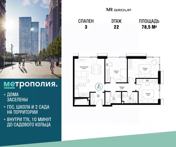 Старт продаж квартир в ЖК бизнес+ класса от девелопера STONE В продаже функциональная и светлая двуспальная квартира с кухней-гостиной и двумя спальнями для реализации любого дизайн-решения, идеально подходящая молодым парам, которые только планируют пополнение, а также небольшим семьям, где малыш уже подрастает. Квартира расположена в камерном низкоэтажном жилом комплексе бизнес+ в одной станции от кольца. STONE Rise находится в уникальной точке с быстрым доступом ко всем ключевым локациям Москвы. Жилой комплекс располагается на границе Таганского района в одной станции от Кольцевой линии метро и в 8 минутах от Садового кольца. Близость к ЦАО обеспечивает выезды на основные магистрали. В 3 минутах от комплекса располагается новый ТПУ Серп Молот, которые объединяет 2 линии метро и МЦД. - 3 мин. м. "Римская", "Площадь Ильича" - 3 мин ТПУ "Серп и Молот", МЦД-2, МЦД-4 - 2 станции на метро до ГЭС-2 и Третьяковки, до Чистых прудов и Сретенского бульвара по салатовой - 10 минут пешком до набережной Яузы и 20 минут до трех разных парков. Архитектура Архитектурный проект разработан московским бюро WALL, известным работой над премиальными жилыми и офисными зданиями. Фасады домов выполнены из бетонной плитки серого и лого м изумрудного оттенков, а также металлических кассет. Вход в комплекс осуществляется через единое гранд-лобби. Здесь будут расположены кофейня, почты с локерами, а также комфортная гостиная с мягкой мебелью. В каждом корпусе расположены лаунж-зоны с естественным освещением в зоне лифтов. Благоустройство Территория комплекса полностью закрыта для машин и случайных посетителей. В центре - прогулочная аллея с дизайнерским освещением и местами для отдыха. В комплексе также обустроена площадка для выгула собак. Маршруты движения внутри двора продуманы для удобства пеших прогулок. Инфраструктура жилого комплекса На первых этажах комплекса расположены кафе, магазины, фитнес-студия и другие сервисные объекты. Двухуровневый подземный паркинг с возможностью выбора стандартных, увеличенных или семейных мест. Для удобства жителей предусмотрены лапомойки, келлеры, места для временного хранения велосипедов и самокатов. В STONE Rise также спроектировано многоуровневое пространство для жителей: - Бизнес-гостиная и детская-игровая, многофункциональное цифровое пространство - Благоустроенная общественная терраса с панорамными видами Девелопер STONE - девелопер коммерческой и жилой недвижимости классов бизнес и премиум в Москве с 18-летним опытом. С 2022 года занимает лидирующую позицию на офисном рынке (рейтинг РБК). Сегодня в портфеле девелопера представлено 2,5 млн кв. м построенных, строящихся и проектируемых объектов, из которых более 850 тыс. кв. м находятся в стадии строительства. Компания имеет самый масштабный проектный портфель офисной недвижимости класса А на московском рынке (данные NF Group) и возглавляет топ-6 устойчивых девелоперов, согласно исследованию FResearch - Forbes. ID.22768 Продам 3-комнатную квартиру в округе ЮВАО в Москве.