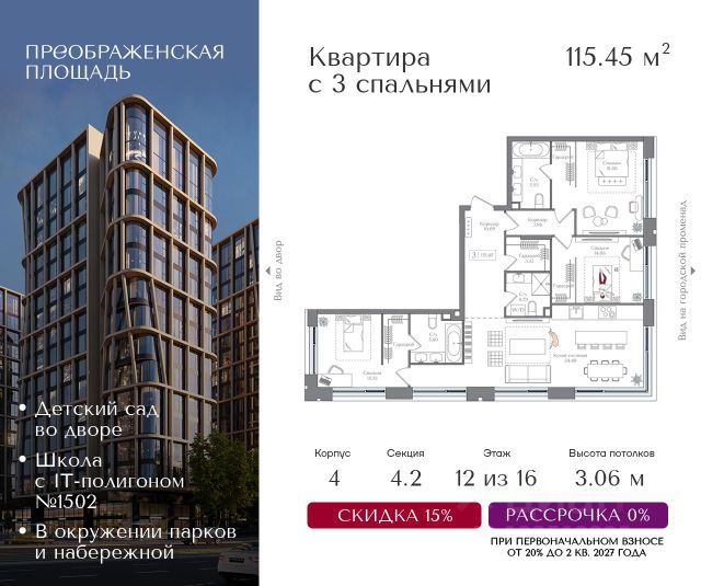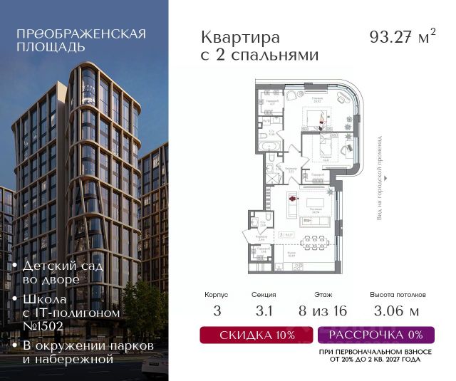 Рассрочка 0% от застройщика. Первоначальный взнос от 20%. Предложение действует до 31 декабря 2025 года Стоимость указана с учетом скидки 10%. Квартира на 8 этаже в жилом комплексе премиум-класса "Преображенская площадь". Общая площадь: 93.27 кв.м. Проект премиум-класса в историческом районе Москвы. До метро "Преображенская площадь" 3 минуты пешком. Квартиры сдаются без отделки и в свободной планировке, чтобы жители могли оформить пространство с учетом своей индивидуальности. Высота потолков от 3,15м, широкоформатное остекление, 3-5 квартир на этаже. Система Умный дом. Дизайнерские лобби. Внутренний двор 1,5 га функциональное и безопасное пространство для игр, работы и занятий спортом. Пешеходный променад для прогулок. Дома переменной этажности. Есть подземный паркинг. Жилой комлекс находится в окружении парков Сокольники, Черкизовский, Измайловский, заповедника Лосиный остров и ВДНХ, а также вблизи пешеходной набережной. Комфортная удаленность от центра: 7 минут на автомобиле до ТТК, 8 минут до Садового кольца, 25 минут до Кремля.