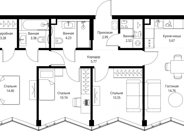 Прямая продажа от застройщика. Продаётся 3-комнатная квартира общей площадью 82.78 м² без отделки в доме премиум-класса МИRА на 17-м этаже 17 этажного дома. Квартира расположена в корпусе 1. Дом премиум-класса МИRA это: • Спокойный район с богатой историей и сложившейся инфраструктурой • Авторская архитектура на стыке классики и современности • Вход в парк прямо из жилого комплекса • Панорамные виды на Яузу, парки, ВДНХ и скульптуру "Рабочий и колхозница" • Удобные сервисы и безопасность для каждого резидента Расположение: Жилой квартал расположен в Алексеевском районе на северо-востоке Москвы, на второй линии домов, таким образом вы сможете дистанцироваться от шума и суеты проспекта Мира, но при этом будете жить недалеко от этой важной городской магистрали. Прямо у дома: • Парк Акведук • Река Яуза • Памятник "Рабочий и колхозница" Пешком: • 16 мин м. ВДНХ На автомобиле: • 12 мин ТТК • 15 мин Садовое кольцо • 12 мин Национальный парк "Лосиный остров" Благоустройство: Концепция благоустройства от бюро "ДРУЖБА" разработана в стиле "Лесная тропа". В уютном дворе расположились словно затерянные в лесу, площадки для отдыха. Они разделяются островками с травами, кустарниками, крупными камнями и деревьями, между которыми проходят узкие песчаные тропинки с деликатной подсветкой по вечерам. Центральной точкой притяжения для жителей станет главная площадь с фонтаном, которая открывается сразу из двух входных групп. Внутренний двор МИRA: • Детская площадка с зонами для игр малышей до трех лет и детей более старшего возраста • Спортивная площадка с профессиональным оборудованием для тренировок • Декоративные перголы • Воздушный арт-объект с подсветкой, похожий на облако • Чайный домик, где в отдельном отапливаемом павильоне можно в любое время года попить кофе с соседями или устроить камерное семейное чаепитие • Зоны для работы и отдыха с гамаком под навесом, скамейками и креслами Инфраструктура и окружение: В Алексеевском районе есть огромные благоустроенные парки, магазины, гимназии с высоким рейтингом и филиалы ВУЗов, частные и государственные детские сады, модные кофейни и фитнес-центры. В квартале МИRА предусмотрены: • 2 ресторана с видом на парк Акведук • 3 кафе • фитнес-студия • подземный паркинг на 330 машино-мест Компания MR предлагает своим клиентам специальные условия приобретения квартир в рамках программ ипотечного кредитования от банков-партнеров.