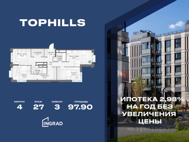 Прямая продажа от застройщика. В жилом квартале, расположенном в Нагорном районе Москвы, продаётся 3-спальная квартира площадью 97.90 кв.м без отделки. Квартира расположена на 27 этаже 27-этажного дома, корпус 4, в жилом квартале бизнес-класса TopHILLS (застройщик ГК Инград). Расположение: Нагорный район - один из наиболее благополучных на юге Москвы. С одной стороны, локация окружена лесопарковой зоной "Долина реки Котловки" и Коробковским садом, с другой - имеет удобную транспортную связь с центром города и доступ к развитой инфраструктуре. Нагорный район Южного округа Москвы не относится к центру города, поэтому здесь менее загруженный автомобильный трафик, позволяющий за 10 минут доехать до ТТК. Для тех, кто предпочитает общественный транспорт - в шаговой доступности станции метро "Нагорная" и "Нагатинская". Отличная транспортная доступность: Даже в часы пик жители квартала возвращаются домой вовремя и не важно, по какому направлению. ТТК в десяти минутах, до метро - рукой подать. Метро Нагорная - 100 метров Метро Нагатинская - 1 км Особенности комплекса и благоустройство: В жилом квартале TopHILLS собственная инфраструктура органично разместилась в стилобате между жилыми корпусами: торговый комплекс, детский развивающий центр, кафе, ресторан домашняя пекарня, супермаркет. Воспользоваться инфраструктурой можно, не снимая тапочек, без выхода на улицу. Стоимость квартиры - 52 290 000 Р. Дом сдан. Более подробную информацию по объекту уточняйте по телефону и в отделе продаж.