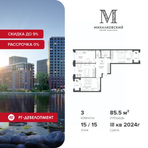 Ипотека для каждого! Полная стоимость кредита от 11,578% до 22,490%. Ставка от 0,11% в АО "Альфа-Банк" фиксируется на 1 год с даты заключения кредитного договора, далее полная стоимость кредита от 25,819% до 28,767% ставка 21,59% до окончания срока кредитования. Первоначальный взнос — от 20% от стоимости квартиры. Срок кредитования — от 3 до 30 лет. Скидка 9% при покупке квартиры! Цена указана с учетом максимального размера скидки. Идет выдача ключей. Продаётся 3-к квартира 85,5 кв.м. в ЖК "Михалковский" на 15-м этаже 15 этажного дома. Компания "РГ-Девелопмент" предоставляет скидки на квартиры в жилом комплексе. Акция действительна с 12.09.2024 г. до 15.11.25г. включительно. Для того чтобы воспользоваться предложением, необходимо подписать договор на приобретение недвижимости до 15.11.25г., включительно. Рассрочка 0% + Скидка 5% на готовые квартиры. Компания "РГ-Девелопмент" запускает комфортную программу рассрочки на квартиры в построенных корпусах. Предложение распространяется на квартиры со свободной планировкой в построенном корпусе 3. Условия: - Скидка 5% - Первый платеж — от 30% от стоимости объекта. - Оставшаяся сумма выплачивается не позднее 31.03.2026. Действует программа "Растет семья - растет и квартира". Прямая продажа от застройщика! Старт продаж новых корпусов. Квартиры без отделки. Срок сдачи корпуса - 3 кв. 2024 г. Особенности проекта: Завораживающие виды из окон Красивое благоустройство Уникальная локация для Москвы (рядом Головинский парк и пруды, усадьба Михалково) Рядом с центром Новый проект "РГ-Девелопмент" объединил в себе все необходимое для комфортной жизни в мегаполисе: узнаваемую архитектуру голландского бюро MLA+, близость зеленых зон, транспортную доступность, благоустроенную территорию с игровыми, спортивными площадками, подземный паркинг, детский сад. Название комплекса указывает на одну из самых привлекательных его черт - соседство со знаменитым имением Михалково, которое когда-то принадлежало известным и даже легендарным для российской истории людям. Это проект c выходом в живописный Головинский парк с пятью прудами привилегия, доступная немногим. Позвольте себе роскошь жить в месте, где создавалась история и когда-то проводили свой досуг знаменитые династии Дашковых и Паниных.