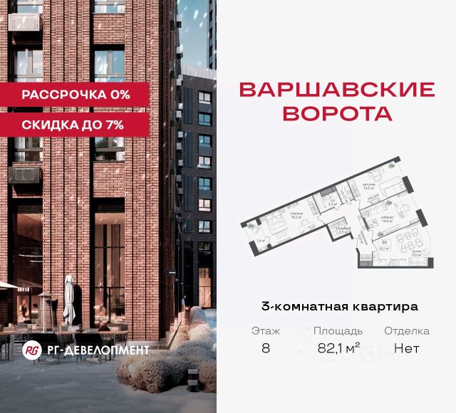 Рассрочка 0% + скидка 5%. Первый платёж 50% при ДДУ, второй 50% — через 12 мес. до ввода ЖК. Продаётся 3-комнатная квартира 82,1 кв.м. в МФК "Варшавские ворота" на 8-м этаже 8 этажного дома. МФК "Варшавские ворота" — это точка баланса между природой и городом, стилем и функциональностью, жизнью сегодня и устойчивым будущим. Коротко о важном: - 1 минута пешком от м. Аннино; - Удобные выезды на Варшавское шоссе и МКАД; - Вид из окон на Битцевский лес и Аннинский лесопарк; - Высота потолков 2,7 - 3 м; - Закрытый двор-парк; - Школы и детские сады в 10-15 минутах пешком от дома; - Технические лоджии для размещения кондиционеров; - Подземный паркинг; - РГ-Девелопмент — ТОП-20 крупнейших застройщиков Москвы. Проект сочетает в себе современную архитектуру и продуманное благоустройство с уникальным природным окружением. Всего в нескольких минутах от дома — девять парков, каскад прудов и крупнейшие лесопарковые зоны Москвы, создающие ощущение жизни в зеленом оазисе посреди мегаполиса. Архитектурная концепция - стиль Чикаго в Москве. Фасады облицованы вентфасадами под клинкерную плитку. Металлические вставки придают динамику, подчёркивая современный характер комплекса. Фасады подчеркивают строгие линии и современный стиль, а входные группы разработаны московским бюро Syntaxis. Лобби оформлены с применением керамогранита, декоративной штукатурки и гипсовых панелей, детали из латуни добавляют изысканности. Проект находится в одной минуте пешком от метро "Аннино", в 12 минутах от станции "Улица Академика Янгеля" и рядом с МЦД-2 "Красный Строитель". Для автомобилистов предусмотрен прямой выезд на Варшавское шоссе и два съезда на МКАД, что позволяет быстро добираться в любую часть города. Среди планировочных решений представлены разнообразные форматы: от функциональных студий до просторных 4-комнатных квартир и апартаментов площадью от 22 до 105 м². Высокие потолки усиливают ощущение простора, а продуманные планировки включают мастер-спальни, гардеробные, угловые окна, объединённые кухни-гостиные и несколько санузлов. Центральное пространство комплекса — закрытый двор без машин. Он разделён на функциональные зоны: детские игровые комплексы, спортивные площадки, воркаут-зоны и уютные места для тихого отдыха. На первых этажах разместятся магазины, кафе и сервисы, что позволит решать повседневные задачи, не покидая территорию комплекса. Для семей с детьми предусмотрен частный детский сад на 50 мест. Подземный паркинг и кладовые обеспечат удобство хранения и безопасность автомобилей. Комплекс окружён девятью парками и лесопарками, каждый из которых обладает своей атмосферой. Выйти на пробежку в Аннинском лесопарке, насладиться прогулками по обширным аллеям в Битцевском лесу, спланировать пикник или велопрогулку в Покровском и Народном парках, любоваться каскадом Кировоградских прудов. Всего в двух станциях — музей-заповедник "Царицыно" с дворцами, фонтанами и живописными пейзажами. Здесь каждый житель найдёт своё любимое мест