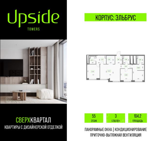 Продаётся 3-комнатная квартира площадью 113.89 кв.м на 19 этаже 19 этажного корпуса Олимп в квартале небоскребов "Upside Towers". В квартире отделка White-box, c видом на Бизнес-парк Останкино, прогулочный бульвар, детский сад, школу, корпус Монте Бьянко, Останкинскую башню. Номер квартиры В1906. Upside Towers - технологичный квартал строится в динамично развивающемся Бутырском районе, в 3 мин. от метро, в 5 мин. от ТТК. На территории 7 га возводится 5 высотных башен от 19 до 58 этажей, названных в честь главных вершин земли. Квартиры с панорамными окнами в пол, высокими потолками и современными инженерными решениями. Благоустроенная зеленая территория включает: приватные дворы, природный комплекс, прогулочный бульвар, ландшафтный парк 2,5 га с сенсорным садом и многофункциональными игровыми и спортивными площадками. В корпусе откроются магазины, кафе и рестораны, а также другие объекты коммерческой инфраструктуры. Большое внимание в проекте уделяется созданию социальной инфраструктуры. Между "Атласом" и "Олимпом" в трехэтажном стилобате разместится уникальное пространство закрытый клуб для жителей квартала Upside Club площадью 2 000 кв. м. Здесь разместятся: каминный зал с роялем, многофункциональная детская зона c двухуровневым игровым оборудованием для малышей и дошкольников, плей-рум для подростков, домашний кинотеатр, коворкинг, переговорные и лектории. На 47 этаже башни "Атлас" откроется SKY SPA Relax с расслабляющей атмосферой, джакузи, сауной, залами для релаксации и йоги. Собственники квартир смогут в любое удобное для них время забронировать посещение спа-зоны через смарт-приложение. На крыше стилобата разместится всесезонная BBQ патио-зона с верандой и закрытыми помещениями для приготовления и отдыха. В башнях откроются смотровые террасы для резидентов с панорамными видами на город, парки, Останкинскую башню, ВДНХ, Ботанический сад и Москву-Сити. Покупая квартиру даже самого минимального размера в Upside Towers, вы получаете в пользование 2 000 м² бесплатных общественных пространств. В рамках проекта строится государственная школа и детский сад, разместится более 15 000 кв.м. коммерческой инфраструктуры. Насыщенная социальная инфраструктура формирует множество сценариев для жизни на территории квартала. В Upside Towers применяются лучшие технологии и практики, чтобы обеспечить высшее качество жизни: Воздух, не уступающий по качеству горному, обеспечит приточно-вытяжная вентиляция. Пятиступенчатая очистка воды с сохранением полезных минералов. Центральное кондиционирование. Внутрипольные конвекторы с естественной конвекцией. Современные системы безопасности и мониторинга микроклимата. Высокоскоростной интернет на всей территории, в квартирах и паркинге за счет усиления GSM-связи всех ведущих операторов. Все места в подземном паркинге оборудованы зарядками для электрокаров. Бутырский район непрерывно развивается и готовится стать новым современным деловым районом Москвы. В рамках программы "Индустриальные кварталы" комплек