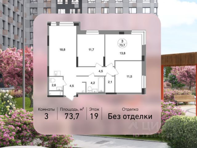 Продается трехкомнатная квартира без отделки в 9 фазе города-парка "Первый Московский". Общая площадь квартиры - 73,7 кв. м, этаж 19 из 19. Срок сдачи - 2 квартал 2027 года. Тип дома - монолитный. ТОЛЬКО ДО 31 МАРТА выгодные условия на приобретение квартиры в ипотеку или рассрочку. Звоните - и мы подберем оптимальное предложение под ваш запрос! Корпус состоит из 3 секций. Город-парк "Первый Московский" расположен всего в 7 км по Киевскому шоссе от МКАД на территории Новой Москвы. Из города-парка прямой выезд на Киевское шоссе и трассу Солнцево-Бутово-Варшавское шоссе. ТРАНСПОРТНАЯ ДОСТУПНОСТЬ: - 5 мин. на личном автомобиле или 10 мин. на автобусе 189, 147, 193 до станции метро "Филатов Луг" - 5 мин. на личном автомобиле или 12 мин. на автобусе 863 до станции метро "Саларьево" - 6 мин. на личном автомобиле или 15 мин. на автобусе 333 до станции метро "Рассказовка" РАЗВИТАЯ ИНФРАСТРУКТУРА В ОКРУЖЕНИИ: - общеобразовательная школа 2120 (корпуса д1, д7, ш1-ш5) - детский сад 2120 (корпуса д2, д9) - школа искусств - городская больница, детская поликлиника, филиал 5 - подстанция скорой помощи 58 и пожарно-спасательный центр 313 - отдел полиции, отдел ГИБДД - торговые центры "Столица" и "Новомосковский" - стадион, каток, бассейн - кафе, продуктовые магазины, аптеки, фитнес-центры, салоны красоты и пр. БЛАГОУСТРОЙСТВО: - дворы без машин - разнообразные детские площадки и развивающие комплексы - детские площадки разделены по возрастным группам - максимальная близость корпуса к парку "Филатов луг" - озеленение территории с учетом зонирования, островками для отдыха ОСОБЕННОСТИ АРХИТЕКТУРЫ: - безбарьерные входные группы - велопарковка на -1 этаже - колясочные в каждой входной группе - коммерческие помещения на 1 этаже в трех секциях - кладовые помещения расположены на жилых этажах и на -1 этаже - в каждой секции корпуса - 4 лифта: 2 пассажирских, 2 грузовых - видеонаблюдение установленное в холлах первых этажей, у подъездов и на прилегающей территории АВТОРСКИЙ ДИЗАЙН: Входные группы выполнены по авторскому дизайну, оснащены системой "тёплый пол". В каждой входной группе будет располагаться комфортабельная зона ожидания, почтовые ящики с ячейкой для спама, колясочная, акцентные пуфы и столик.