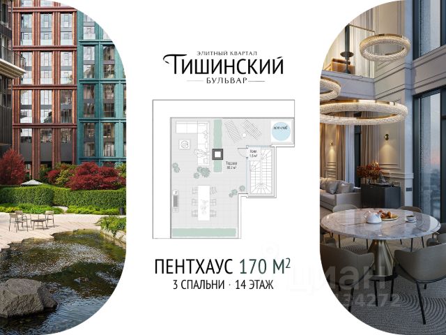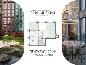 В пентхаусе: • 3 спальни • Просторные гардеробные и постирочная • Высокие потолки 4 метра • Панорамные окна • Терраса площадью 126,6 м2 • Пять балконов "Тишинский бульвар" - тихий зелёный элитный квартал с собственным просторным зелёным парком в окружении уютных улочек с их камерной спокойной атмосферой. "Тишинский бульвар" находится в престижном историческом районе центра Москвы. Название местности неслучайно произошло от слова "тишина": жилые улочки, окружающие элитный квартал, создают атмосферу уюта и позволяют отдохнуть от шума и суеты мегаполиса. В 450 метрах от "Тишинского бульвара" расположен собор Непорочного Зачатия Пресвятой Девы Марии - ныне крупнейший в России католический храм. Под его историческими сводами проходят органные концерты. Вы в центре светской жизни. Патриаршие пруды - излюбленное место для летних прогулок, воскресных бранчей и романтических ужинов - находятся всего в 1,5 км от квартала. В "Тишинском бульваре" только для жителей и их гостей создан уникальный для элитного дома широкий прогулочный бульвар длиной 300 метров. Он проходит через весь квартал и объединяет три двора в общее пространство: Кленовый, Рябиновый и Ивовый. Мощение бульвара украшено инкрустацией в виде листьев рябины, клёна и ивы - символов каждого из дворов. Парк занимает 1,9 гектара - это площадь четырёх футбольных полей. Продуманное озеленение - всесезонные растения с разными периодами цветения - создаёт хорошее настроение в любое время года. Элитный квартал "Тишинский бульвар" обладает насыщенной инфраструктурой только для жителей. В эксклюзивном Clubhouse собраны все необходимые пространства для отдыха и общения, занятий спортом, детских игр и праздников: • фитнес-зал с бассейном длиной 25 метров и спа; • многофункциональная площадка для командных видов спорта; • воркаут-зона на свежем воздухе по стандарту Fit Lab; • игровая комната и детские площадки Kid`s Lab; • клубная гостиная по стандарту Friend`s Lab; • общественные зоны отдыха под открытым небом и пространства крытых галерей; • частный детский сад. Индивидуальное архитектурное решение каждого дома формирует гармоничный облик всего квартала. В отделке фасадов используются натуральные материалы: светлый и тёмный гранит, известняк, глазурованный и матовый клинкерный кирпич, алюминиевые панели различных оттенков. Они меняют свой цвет от розоватого на рассвете до насыщенно-медового на закате. Балконы и террасы создают оригинальную пластику архитектуры и функционально расширяют жилое пространство. Высокое качество жизни в элитном квартале "Тишинский бульвар" обеспечивают самые полные системы комфорта от Sminex.