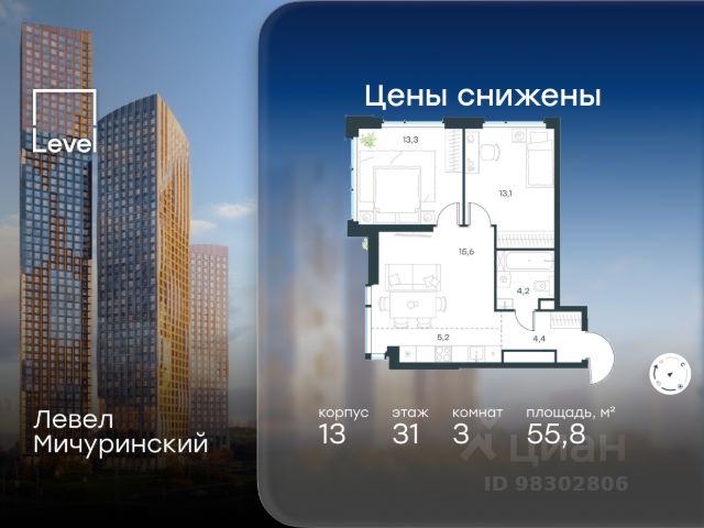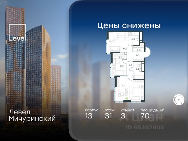 Скидка 35% на все квартиры в жилом комплексе Левел Мичуринский, этапы 3 и 4 (корпуса 7-13). Цена указана с учётом скидки при 100%-й оплате, несубсидированной ипотеке, рассрочке (кроме программы "Рассрочка 0%"). В жилом квартале, расположенном на границе с природным заказником "Долина реки Очаковки", продаётся 3-комнатная квартира площадью 69.60 кв.м без отделки. Квартира расположена на 24 этаже 24-этажного корпуса 7 в жилом комплексе бизнес-класса Левел Мичуринский (компания Level Group/Левел групп). Отличная транспортная доступность: - от 10 мин. пешком до станции метро "Мичуринский проспект" - 15 мин. пешком до станции метро "Аминьевская" - 7 мин. на авто до МКАД - 10 мин. на авто до ТТК - 15 мин. на авто до Москва-Сити Продуманный архитектурный проект: - Выразительная архитектура от известных бюро: корпуса 1-6 - бюро СПИЧ, корпуса 7-13 - архитектурное бюро Анатолия Борисова; - Из окон открываются живописные виды на парки, Москва-Сити и МГУ; - Высокие потолки до 6,35 м; - Стильные лобби с окнами в пол и высокими потолками до 4,7 м; - С каждого этажа дома на лифте можно спуститься в подземный отапливаемый паркинг. Расположение: Жилой комплекс Левел Мичуринский строится в одном из самых зелёных районов Москвы - Очаково-Матвеевское. Этот уголок столицы идеален для поддержания здорового образа жизни. В шаговой доступности от проекта находятся заказник "Долина реки Очаковки" - 1 мин. пешком и Очаковский парк - 7 мин. пешком. На велосипеде можно добраться до таких парков, как "Событие", парк Олимпийской деревни, парк 50-летия Октября и парк Школьников. В 15 минутах езды на авто расположено более 30 детских садов (из них 14 в пешей доступности), 32 школы (из них 13 в пешей доступности) и 14 вузов. Также в ближайшем окружении - более 25 медицинских учреждений, 11 спортивных клубов и 22 продуктовых супермаркета. Внутренняя инфраструктура: На территории жилого комплекса строится три детских сада и школа. На первых этажах домов откроется супермаркет, фитнес-центр, ресторан, кафе и другие сервисы. Подземные этажи займут паркинги: трёхуровневые - в этапах 1 и 2, одноуровневый - в этапах 3 и 4. Преимущества проекта: - 4,5 га благоустроенной территории с видовым мостом, уличным кинотеатром, зонами для тихого отдыха, работы, уличных тренировок, площадки для петанка, футбола, настольного тенниса и пляжного волейбола. - Дизайнерские лобби с панорамным видом на двор, мойками для лап животных и комфортными зонами ожидания. - Безопасность жителей: круглосуточное видеонаблюдение всех зон общего пользования (лобби, лифты, паркинги, детские площадки), система контроля доступа, управление видеодомофоном через мобильное приложение, единый ключ доступа на территорию жилого комплекса. - Технологии и комфорт: высокоскоростной вайфай в лобби и на придомовой территории, автоматическая система контроля и учёта ресурсов, абонентская связь с консьержем, распознавание номеров автомобилей при въезде в паркинг и выезде из не