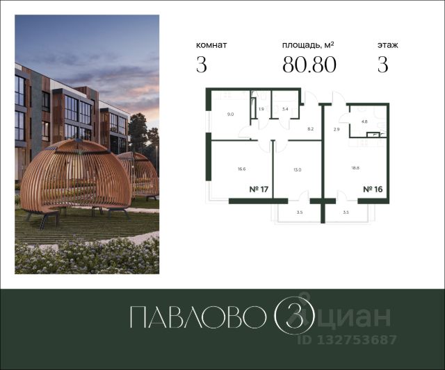Старт продаж! Продается 3-комнатная квартира в новом клубном жилом комплексе "Павлово 3" площадью - 80,8 кв. м полученная за счёт объединения 2-х квартир на 3 этаже, в корпусе 2 в малоэтажном монолитном доме от компании-застройщика. Из окон, а также с балкона, открывается вид на лес и дорогу. В квартире предусмотрен отдельный рабочий кабинет. В квартире высокие потолки 3,25 м, что дает ощущение простора. "Павлово 3" - премиальный уровень комфорта загородной жизни в бизнес-классе. Выбирайте камерный квартал, он станет лучшим домом для каждого, кто ценит приватность и комфорт. Срок сдачи - 2 квартал 2027. Более подробная информация по телефону. Особенности комплекса: • Высота потолков в каждой квартире - от 3 метров; • Собственный детский сад; • Авторская концепция озеленения; • МЦД-2 "Нахабино" в 5 минутах езды; • Садовое кольцо в 35 минутах езды • Локация с насыщенной инфраструктурой столичного уровня: торговые центры, кафе, рестораны, учебные заведения, развлекательные и спортивные объекты. Расположение Клубный жилой комплекс бизнес-класса "Павлово 3" возводится в экологически чистом районе престижного северо-западного направления Москвы. Здесь природа и атмосфера спокойствия соседствуют с комфортом современного мегаполиса. 7 трехэтажных корпусов, выполненных в едином современном стиле, формируют уютную камерную атмосферу. Архитектура На первых этажах домов - просторные и функциональные входные группы, где предусмотрено все: мягкий интерьер в природных тонах, дизайнерская отделка натуральным деревом и камнем, панорамные окна с видом на лес, помещения для хранения колясок и спортивного инвентаря, а также специальные подъемники для маломобильных жителей. Благоустройство "Павлово 3" - это 6 га приватной охраняемой территории, 2 км прогулочных дорожек вдоль леса, 19 зон для тихого и активного отдыха и 3963 деревьев и цветущих кустарников, высаженных непосредственно на территории комплекса. Чтобы оказаться наедине с природой теперь достаточно пары минут пешком. Для жителей "Павлово 3" создан собственный выход в лес, благоустроены лаунж-зоны на свежем воздухе и гармонично вписаны в ландшафт ливневые сады. Здесь же появится барбекю-зона для уютных вечеров в кругу семьи и друзей. Инфраструктура Жителям доступна инфраструктура престижного района с известными ресторанами, спортивными клубами и рейтинговыми учебными заведениями. На территории клубного дома детям не придется скучать. В их распоряжении - 16 игровых площадок с инвентарем из природных безопасных материалов. А для поддержания здорового образа жизни предусмотрено 5 спортивных зон, включая воркаут-тренажеры, корты для мини-футбола, волейбола, падел-тенниса и баскетбола. Для гостей предусмотрен свой паркинг, а для владельцев электромобилей - зарядные станции. Количество машиномест равно количеству квартир. Вся территория оснащена системами безопасности и камерами видеонаблюдения, работает WI-FI.