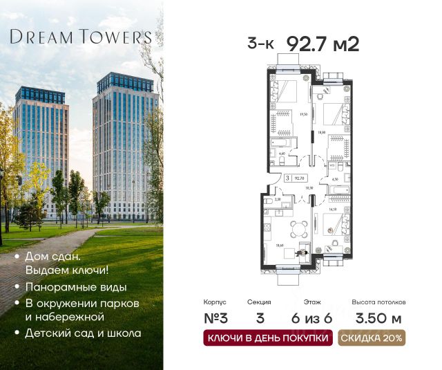 Рассрочка 0% от застройщика. Ключи в день покупки. ЖК Dream Towers проект премиум-класса в окружении парков и набережной, с полностью готовой инфраструктурой для комфортной жизни и отдыха. Продаётся 3-квартира на 6 этаже 6-этажного дома (3 корпус). Общая площадь: 92.7 кв.м. Высота потолков от 3.50 м. Город-курорт на 100 Га в шаге от вашего дома: - пляжный комлекс Dream Beach Club; - парк аттракционов Остров Мечты; - 44 Га ландшафтных парков; - пешеходная набережная; - яхт-клуб; - Южный речной вокзал; - вейк-парк и многое другое. В Dream Towers предусмотрено все для комфортной жизни с семьей: - дизайнерские лобби с общественной гостиной, колясочной и лапомойками; - охраняемый благоустроенной двор только для жителей; - собственный десткий сад и школа прямо во дворе; - красивая архитектура зданий в стиле Ар-деко; - облицовка фасадов из натурального камня с архитектурной подсветкой; - широкоформатное остекление окон в пол для лучших видовых характеристик на парки и пойму Москвы-реки; - подземный паркинг; - клубный формат проживания; - эргономичные планировки от 40 до 162 м2; - высокие потолки от 3,15 до 4,1 м; - квартиры с террасами; - вся необходимая инфраструктура на первых этажах домов, а также в торговой части тематического парка "Остров Мечты" (рестораны, кафе, супермаркет, магазины, салон красоты, йога-студия и многое другое). Центр рядом: 15 минут до Садового кольца на авто, 20 минут до Сити или Кремля. В 5 минутах прогулочным шагом — станция метро "Технопарк".