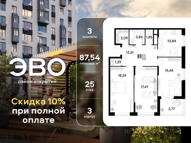 Продается трекомнатная квартира 87.54 кв.м. в жилом комплексе ЭВО на 25 этаже по адресу: Московская область, г. Реутов, ул. Комсомольская. Скидка 10% при полной оплате!* ЭВО - проект комфорт-класса от девелопера Dogma. Каждый житель сможет открыть для себя максимум возможностей. Совершенствоваться во всех направлениях: физическом, эмоциональном и материальном. В ЭВО можно открыть для себя новые виды спорта, найти единомышленников по хобби, партнеров по бизнесу, развивать в детях новые грани, наслаждаться природой и лаконичной архитектурой. Более 6 га благоустройства в первой очереди! - Зеленый двор без машин, кленовая аллея для прогулок. - Нейродинамические площадки для детей разных возрастов. - Зона уличных тренажеров, столы для пинг-понга, места для занятия йогой. велодорожки и дорожки для скандинавской ходьбы. - Детский сад на 180 мест и школа на 750 мест. - Зона книгообмена - Лобби с зоной ожидания, колясочной и лапомойкой. - Магазины и кафе на первых этажах. БЕЗОПАСНОСТЬ - Закрытая территория. - Круглосуточное видеонаблюдение. - Контроль доступа. РАСПОЛОЖЕНИЕ Пешком - 7 минут до станции Реутов. - 20 минут до метро Новокосино. На машине - 4 минуты до МКАД. - 6 минут до шоссе Энтузиастов. - 9 минут до Носовихинское шоссе. - 13 минут до МСД (Московский скоростной диаметр). СОЦИАЛЬНАЯ ИНФРАСТРУКТУРА В первой очереди предусмотрено строительство детского сада на 180 мест и школы на 750 учащихся. В 10 минутах ходьбы от ЭВО находится детский технопарк "Изобретариум", в котором более 60 научных секции: от IT до промышленного дизайна. Для творческих ребят рядом есть художественная и музыкальные школы, хоровая студия. ОКРУЖЕНИЕ - Реутовский центральный парк, Александровский сквер, Фабричный пруд. - ТЦ "Экватор", ТК "Шоколад". - Спортивный комплекс "Старт", Ледовый комплекс "Реутов Арена". - Музей-усадьба "Кусково". *Подробности уточняйте по телефону.