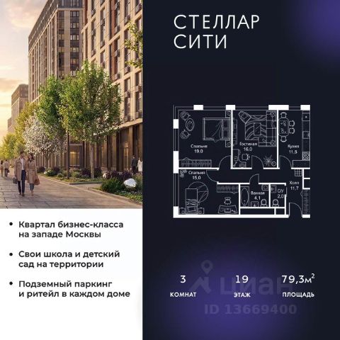 Продается квартира от надежного застройщика Tashir Estate в квартале бизнес-класса Stellar City в ЗАО Москвы. Площадь квартиры составляет: 100.5 кв. м, потолки: 3.1 м Квартира находится на 19 этаже, 4 корпуса жилого квартала Stellar City — микрогорода будущего на орбите Москвы. Stellar City — квартал в ЗАО Москвы вблизи инновационного центра Сколково. В окружении — 11 парков и природных зон, в том числе Долина реки Сетунь, Мещерский лес и парк развлечений The Rink. Город в городе Чтобы дом и инфраструктура вокруг отвечала динамичному лайфстайлу жителя мегаполиса, в основу проекта легла концепция город в городе, которая позволяет решать все бытовые вопросы in-home. В квартале будут возведены школа и детский сад, воркаут-зоны, променад, вело и беговые дорожки, детские площадки для каждого корпуса, а также коммерция на первых этажах для ежедневных покупок. Все необходимое — на расстоянии нескольких шагов. Изящные и лаконичные лобби Авторский дизайн, натуральные материалы в отделке и безупречный интерьер вне времени. Лобби и холлы в проекте бизнес-класса Stellar City ничем не отличаются от входных групп в премиум-сегменте благодаря качественным европейским материалам в отделке, стильному дизайну, консьерж-сервису и уютной зоне ожидания с журнальными столиками и мягкой мебелью. Комфорт и безопасность Закрытая территория, охрана, система СКУД, специально разработанное мобильное приложение дома для резидентов и подземный паркинг с круглосуточным наблюдением и доступом с помощью автоматического считывания номера авто.