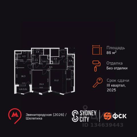 Прямая продажа от застройщика! Жилой Комплекс премиум-класса. Продаётся 3-к квартира номер 293 общей площадью 86.3 кв.м. на 26-м этаже 26 этажного здания. Без отделки. Цена с учётом скидки. Особенности квартиры: - Мастер-зона с санузлом. Уют и комфорт в одном пространстве. - Линейная планировка - максимальная функциональность и удобство. - Увеличенное количество окон - дополнительное освещение и свежий воздух. - Гостевой санузел - комфорт и удобство для ваших гостей. - Душ помимо ванной - дополнительное удобство для вашей семьи. - Постирочная - организуйте пространство для стирки и сушки вещей. - Евроформат - просторное и удобное жилье с отличной планировкой. - Место для игры/занятия спортом - идеальное пространство для активных детей. - Можно оборудовать рабочее место - комфорт для работы и учёбы. - Возможность добавить спальное место - дополнительный комфорт для гостей. - Гардеробная - удобство для хранения и организации вещей. - Ниша под шкаф - компактное и удобное место для вещей. - Лоджия - уютное место для отдыха и тишины. Информация о комплексе: Премиум-класс прямо на берегу Москвы-реки, с прямым выходом на набережную и потрясающими панорамными видами! На Шелепихинской набережной, расположен причал для речных трамваев. Вам станет доступна единственная столичная транспортная артерия, на которой никогда нет пробок: 20 минут до Москва-Сити, да еще и с вдохновляющими видами по пути. Входные группы домов - это индивидуальные дизайн-проекты, посвященные трем главным местам в жизни Лермонтова: Тарханам, Петербургу и Кавказу, которые объединяют сочетание эстетики и комфорта. Бурная жизнь соседей больше не сможет нарушить ваш покой, а к вам никто не постучит, если вы захотите прибавить громкость в любимом музыкальном треке или Ваши дети захотят устроить ночную пробежку! Живите только по своим правилам. В каждой квартире подключен базовый пакет Умная квартира забудьте о беспокойстве о протечке; настройте свои сценарии управления техникой и электричеством; общайтесь с Умной квартирой голосом; Можете легко расширить базовый пакет и подключить дополнительные опции и устройства, чтобы из любой точки мира управляй работой бытовых приборов и систем, например: включайте разогрев ужина; регулируйте яркость яркость света; регулируйте громкость музыки; настраивайте работу теплых полов; Транспортная доступность: В 50 м до новой станции метро "Звенигородская". Вторая улица от ЦАО и соседство с Москва-Сити. Все виды общественного транспорта, в том числе речные трамвайчики, в пешей доступности Внутренняя инфраструктура: Основная артерия жизни квартала - центральный бульвар. Вы с радостью обнаружите, что путь до престижных школ и вузов, развлечений и магазинов сжался до нескольких минут езды на машине. К вашим услугам: