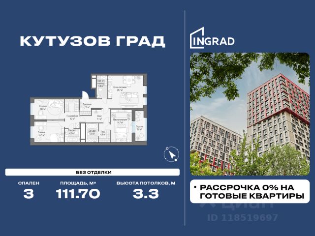 Продается просторная трехкомнатная квартира площадью 82 м² в корпусе "Созидание" клубного дома "Кутузов Сити". Функциональная планировка квартиры идеально подойдёт для семьи. В квартире три изолированные комнаты. Одна из них — мастер-спальня с ванной комнатой и гардеробной, а в одной из комнат находится просторная угловая терраса с панорамным видом. Здесь можно устроить зону для отдыха на свежем воздухе. Кухня-столовая — это сердце дома, где удобно готовить и вместе собираться за обеденным столом. Здесь достаточно места и для приготовления еды, и для общения с близкими, и для атмосферных встреч с друзьями. В общей сложности, в квартире предусмотрено две ванных комнаты. В просторной прихожей предусмотрено место для хранения. Большие окна наполняют квартиру естественным светом и делают интерьер стильным. Высокие потолки придадут пространству ощущение свободы и лёгкости. О проекте: "Кутузов Сити" — клубный дом на 220 квартир, разработанный совместно с бюро Atrium и Oleg Klodt Architecture & Design. Проект строится в престижном Западном административном округе Москвы, всего в нескольких минутах ходьбы от Кутузовского проспекта. Закрытая территория, приватный двор, подземный паркинг и стильные лобби создают атмосферу комфорта и безопасности. В двух шагах от дома находится одна из крупнейших природных территорий Москвы — природный заказник "Долина реки Сетунь". Камерная застройка и развитая инфраструктура делают "Кутузов Сити" отличным выбором для тех, кто ценит качество жизни и близость к природе. (Лот: 220)