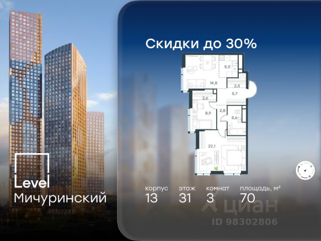 О квартире Продаётся 3-комнатная квартира общей площадью 70.4 кв.м. без отделки. Квартира расположена на 13 этаже корпуса 5.6 в жилом комплексе бизнес-класса "Среда на Лобачевского" в пешей доступности от метро "Аминьевская". О жилом комплексе "Среда на Лобачевского" полностью соответствует критериям современного жилого пространства. Взяв за основу рациональный подход, мы гармонично соединили дизайн, актуальные тренды и функциональность. Продуманный современный экстерьер и функциональные планировки внутри, приватные пространства и разнообразные досуговые зоны для каждого члена семьи — все это "Среда на Лобачевского". Инфраструктура Район отлично развит и наполнен жизнью, здесь уже есть вся необходимая инфраструктура — детские сады, школы, медучреждения, торговые центры, благоустроены парки для прогулок и отдыха, удобен и легкодоступен городской транспорт. Рядом расположены учебные корпуса крупных университетов — МГУ, МГИМО и РАНХиГС. Школы и детские сады в районе занимают высокие позиции в городских рейтингах, поэтому вам не придется беспокоиться о качестве образования детей. Как и об отдыхе: поблизости расположены живописные пруды, реки и парки. Это Парк Олимпийской деревни, Парк имени 50-летия Октября, Мещерский парк и Очаковские пруды. Теперь поставить галочки в еженедельном чек-листе "спорт-прогулки-встречи с друзьями" можно, не покидая любимый район. Особенности Особое внимание в проекте уделяется созданию функциональных пространств не только внутри дома, но и за его пределами. В ландшафтном парке "Среды на Лобачевского" расположены крытые зоны для спокойного времяпровождения, места для активного отдыха и спорта, коворкинг, соседский комьюнити-центр, водные объекты. —Ландшафтный парк во дворе. —Водный сад с зонами отдыха. —Зоны коворкинга. —Дизайнерские гранд-лобби. —Бесключевой доступ. —Подземный паркинг.