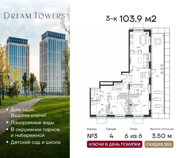 Рассрочка 0% от застройщика. Ключи в день покупки. ЖК Dream Towers проект премиум-класса в окружении парков и набережной, с полностью готовой инфраструктурой для комфортной жизни и отдыха. Продаётся 3-квартира на 6 этаже 6-этажного дома (3 корпус). Общая площадь: 111.8 кв.м. Высота потолков от 3.50 м. Город-курорт на 100 Га в шаге от вашего дома: - пляжный комлекс Dream Beach Club; - парк аттракционов Остров Мечты; - 44 Га ландшафтных парков; - пешеходная набережная; - яхт-клуб; - Южный речной вокзал; - вейк-парк и многое другое. В Dream Towers предусмотрено все для комфортной жизни с семьей: - дизайнерские лобби с общественной гостиной, колясочной и лапомойками; - охраняемый благоустроенной двор только для жителей; - собственный десткий сад и школа прямо во дворе; - красивая архитектура зданий в стиле Ар-деко; - облицовка фасадов из натурального камня с архитектурной подсветкой; - широкоформатное остекление окон в пол для лучших видовых характеристик на парки и пойму Москвы-реки; - подземный паркинг; - клубный формат проживания; - эргономичные планировки от 40 до 162 м2; - высокие потолки от 3,15 до 4,1 м; - квартиры с террасами; - вся необходимая инфраструктура на первых этажах домов, а также в торговой части тематического парка "Остров Мечты" (рестораны, кафе, супермаркет, магазины, салон красоты, йога-студия и многое другое). Центр рядом: 15 минут до Садового кольца на авто, 20 минут до Сити или Кремля. В 5 минутах прогулочным шагом — станция метро "Технопарк".