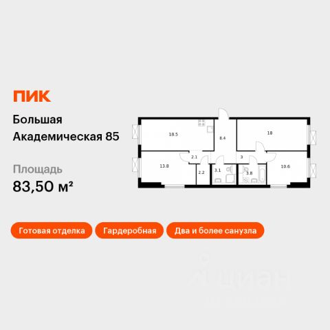 Продаётся 3-комн. апартаменты площадью 83,5 кв.м на 14 этаже 14 этажного дома (Корпус 3.5, Секция 1) проекта ПИК Большая Академическая 85. Светлый просторный подъезд на уровне земли, функциональная планировка, большие окна, c отделкой. "Большая Академическая 85" возводится в Тимирязевском районе — одном из самых тихих и зелёных мест в Москве. От домов до метро "Окружная" — 15 минут пешком, а до станции МЦК "Лихоборы" — 11 минут. Рядом с "Большой Академической 85" есть всё необходимое для комфортной жизни: поблизости работают семь детских садов, шесть школ, три вуза и два торговых центра. Вокруг много парков, в которых приятно гулять и отдыхать. В жилой квартал входят одиннадцать корпусов, в которых есть квартиры и апартаменты. Переменная высота домов — от 11 до 24 этажей — создаёт ощущение простора и позволяет солнечному свету свободно проникать во дворы и комнаты. Фасады природных цветов украшены разными фактурными элементами, поэтому каждый дом выглядит по-особенному. В домах просторные и светлые подъезды без ступеней и пандусов, с выходами во двор и на улицу. На первых этажах домов — магазины и кафе. Для владельцев автомобилей предусмотрен подземный паркинг, а для самых маленьких жителей — собственный детский сад, который объединён с начальной школой. В зелёных дворах-парках оборудованы современные детские площадки и места для отдыха. Ещё на территории проекта есть Local Play — большое игровое пространство для детей, где будет интересно и малышам, и подросткам. Артикул 924668 (Застройщик ООО "СПЕЦИАЛИЗИРОВАННЫЙ ЗАСТРОЙЩИК ЛИХОБОРЫ")