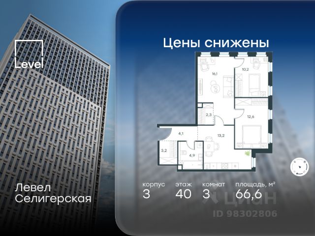 Прямая продажа от застройщика. Продаётся 3-комнатная квартира общей площадью 109.90 м² с предчистовой отделкой в ЖК "Селигер Сити" на 39-м этаже башни Лисицкого. Корпуса четвертой очереди ЖК "Селигер сити" названы в честь трех великих представителей науки и архитектуры, новаторское видение которых — слишком смелое для своего времени — нашло воплощение в уникальных домах жилого комплекса. Вдохновленные авангардными идеями знаменитого советского архитектора Эля Лисицкого, архитекторы создали яркий центр притяжения всего района, задающий новый стандарт жизни в современном мегаполисе — две высокие "Башни Лисицкого" с современной интерпретацией горизонтального небоскреба. Преимущества проекта: - 2 минуты пешком от метро "Селигерская" - Архитектурное решение от голландского бюро MLA + - Одна из самых больших придомовых территорий в Москве - Огороженная охраняемая территория, круглосуточное видеонаблюдение - Европейский подход к благоустройству от бюро Wowhaus: появится парадный бульвар, аллея с фонтаном и арт-объектом, что дополнит уже сформированное благоустройство: детские площадки для разных возрастов, площадки для воркаута, дорожки для бега и пеших прогулок, места для отдыха - Два детских сада, школа начальных классов и центр доп.образования - Искусственный пруд на территории комплекса с благоустроенной набережной и мостом - Продуманная концепция инфраструктуры: уютные кафе и рестораны, супермаркет, магазин фермерских продуктов, бытовые службы, салон красоты, детские сады - Ультрасовременные инженерные решения - Подземный паркинг с зарядными станциями для электромобилей, постами подкачки шин и келлерами - Лобби по индивидуальному дизайн проекту от европейского бюро Вlank Architects: лаунж-зоны, ресепшен, колясочная, помещение для мытья лап животным после прогулки - Надежный девелопер с опытом премиальных проектов MR Расположение комплекса: - 2 минуты от станции метро "Селигерская" - 7 минут на машине до станции метро "Окружная" - Предусмотрен удобный выезд в сторону ТТК (всего 9 км или 15 минут без пробок) - МКАД в 10 минутах на машине Компания MR предлагает своим клиентам специальные условия приобретения квартир в рамках программ ипотечного кредитования от банков-партнеров.