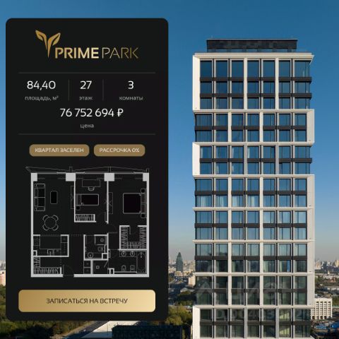 Жилой квартал Prime Park воплощает все преимущества premium-living. Престижная локация на Ленинградском проспекте, 37: - 5 мин. от Тверской улицы, Патриарших прудов и Белой площади, - 20 мин. до аэропорта "Шереметьево" или "Москва-Сити", - 4 парка — Ходынское поле, Петровский и Чапаевский парки, Березовая роща, - 4 станции метро — "ЦСКА", "Аэропорт", "Динамо" и "Петровский парк". Многократный победитель премий European Property Awards и Urban Awards, а также на протяжении пяти лет остается самым продаваемым проектом в своем сегменте. Premium-living Консьержи предугадывают желания резидентов и берут на себя выполнение практически любых бытовых задач. В квартале также есть парк-рейнджер и охрана. Для дополнительного удобства в МОПах предусмотрены почтовые комнаты, колясочные и комнаты для мытья лап домашних питомцев, комната для хранения интернет-заказов. Наличие сервисного входа для персонала позволяет разделить трафик, сохраняя приватную атмосферу в лобби. Резидентам нужно открыть только одну дверь, чтобы оказаться дома: valet-парковщики открывают дверь автомобиля и отвозят его на подземный паркинг, беллмены открывают двери при входе в башню и помогают донести вещи до квартиры, интеллектуальная система обеспечивает бесконтактный вызов лифта. Развитая инфраструктура Близость к центру Москвы, рядом крупнейший ТЦ "Авиапарк", ВТБ Арена, Мегаспорт, ВЭБ Арена, в окружении красивейших парков, включая ультрасовременный Ходынский парк площадью 25 га с панорамными качелями, набережной, фонтанами, детскими и спортивными площадками. На территории квартала предусмотрены приватный фитнес-центр с 25-метровым бассейном и спа, подземный паркинг с кладовыми, местами для хранения велосипедов, электрозарядками и детейлинг-центром для обслуживания автомобилей. На первых этажах башен расположатся кафе и рестораны, цветочный магазин, аптека, салон красоты, премиальный супермаркет и бытовые сервисы. Частный парк Общее парковое пространство квартала — 5,5 га, из них 3 га отведено под частный парк эксклюзивно для резидентов. Большой фонтан, аллеи для прогулок, крупномерные деревья, арт-инсталляции, водные глади, детские площадки и воркаут-зона создают гармоничное сочетание жизни на природе со всеми преимуществами мегаполиса. Уникальная квартирография Более 80 вариантов планировочных решений от однокомнатных квартир до двухуровневых дуплексов и пентхаусов. Панорамные окна, высокие потолки, мастер-спальни, балконы и террасы создают особенный комфорт и уют. Авторская архитектура и дизайн Четыре башни сданы, ключи выдаются в день сделки, 2 башни на этапе строительства, сдача в 2023 и 2024 гг. Уникальный архитектурный ансамбль и ландшафтный дизайн, благородные и ценные материалы в оформлении лобби, предметы искусства, арт-объекты и элементы декора, выполненные на заказ специально для Prime Park, становятся отражением яркой индивидуальности резидентов квартала. 3-комнатная квартира в готовой новостройке рядом с метро Аэропорт.