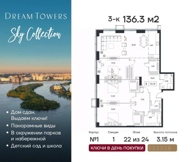 Рассрочка 0% от застройщика. Ключи в день покупки. ЖК Dream Towers проект премиум-класса в окружении парков и набережной, с полностью готовой инфраструктурой для комфортной жизни и отдыха. Продаётся 3-квартира на 6 этаже 6-этажного дома (3 корпус). Общая площадь: 144.2 кв.м. Высота потолков от 3.50 м. Город-курорт на 100 Га в шаге от вашего дома: - пляжный комлекс Dream Beach Club; - парк аттракционов Остров Мечты; - 44 Га ландшафтных парков; - пешеходная набережная; - яхт-клуб; - Южный речной вокзал; - вейк-парк и многое другое. В Dream Towers предусмотрено все для комфортной жизни с семьей: - дизайнерские лобби с общественной гостиной, колясочной и лапомойками; - охраняемый благоустроенной двор только для жителей; - собственный десткий сад и школа прямо во дворе; - красивая архитектура зданий в стиле Ар-деко; - облицовка фасадов из натурального камня с архитектурной подсветкой; - широкоформатное остекление окон в пол для лучших видовых характеристик на парки и пойму Москвы-реки; - подземный паркинг; - клубный формат проживания; - эргономичные планировки от 40 до 162 м2; - высокие потолки от 3,15 до 4,1 м; - квартиры с террасами; - вся необходимая инфраструктура на первых этажах домов, а также в торговой части тематического парка "Остров Мечты" (рестораны, кафе, супермаркет, магазины, салон красоты, йога-студия и многое другое). Центр рядом: 15 минут до Садового кольца на авто, 20 минут до Сити или Кремля. В 5 минутах прогулочным шагом — станция метро "Технопарк". 3-комнатная квартира в готовой новостройке в районе Нагатинский затон в Москве.
