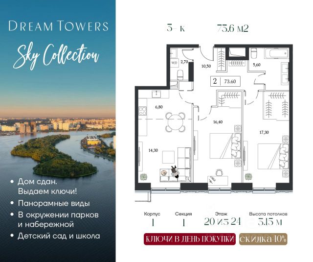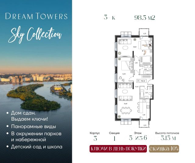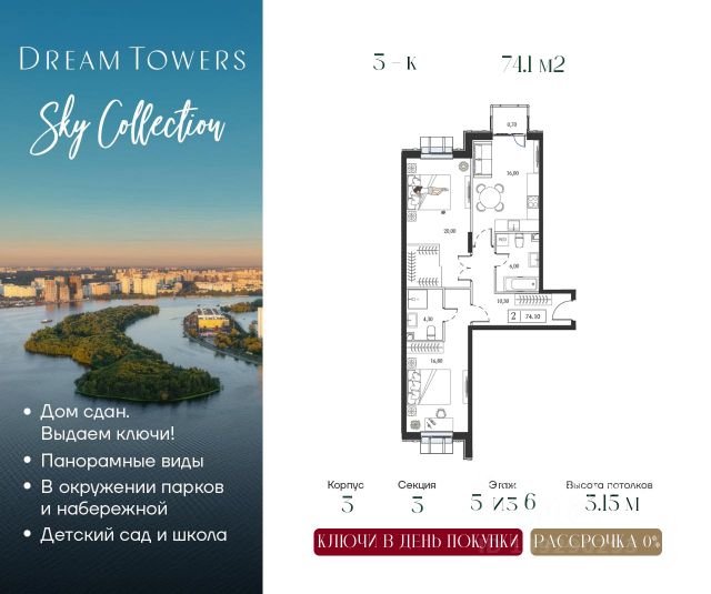 Рассрочка 0% от застройщика. Ключи в день покупки. ЖК Dream Towers — проект премиум-класса в окружении парков и набережной, с полностью готовой инфраструктурой для комфортной жизни и отдыха. Продаётся 3-квартира на 6 этаже 6-этажного дома (3 корпус). Общая площадь: 103.9 кв.м. Высота потолков от 3.15 м. Город-курорт на 100 Га в шаге от вашего дома: • пляжный комплекс Dream Beach Club; • парк аттракционов Остров Мечты; • 44 Га ландшафтных парков; • пешеходная набережная; • яхт-клуб; • Южный речной вокзал; • вейк-парк и многое другое. В Dream Towers предусмотрено все для комфортной жизни с семьей: • дизайнерские лобби с общественной гостиной, колясочной и лапомойками; • охраняемый благоустроенной двор только для жителей; • собственный десткий сад и школа прямо во дворе; • красивая архитектура зданий в стиле Ар-деко; • облицовка фасадов из натурального камня с архитектурной подсветкой; • широкоформатное остекление окон в пол для лучших видовых характеристик на парки и пойму Москвы-реки; • подземный паркинг; • клубный формат проживания; • эргономичные планировки от 40 до 162 м2; • высокие потолки от 3,15 до 4,1 м; • квартиры с террасами; • вся необходимая инфраструктура на первых этажах домов, а также в торговой частия тематического парка "Остров Мечты" (рестораны, кафе, супермаркет, магазины, салон красоты, йога-студия и многое другое). Центр рядом: 15 минут до Садового кольца на авто, 20 минут до Сити или Кремля. В 5 минутах прогулочным шагом — станция метро "Технопарк". 3-комнатная квартира в готовой новостройке в районе Нагатинский затон в Москве.
