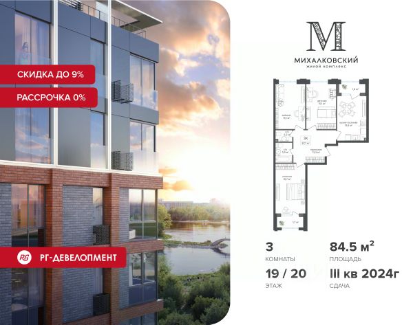 Рассрочка 0% + Скидка 5% на готовые квартиры. Компания "РГ-Девелопмент" запускает комфортную программу рассрочки на квартиры в построенных корпусах. Предложение распространяется на квартиры со свободной планировкой в построенном корпусе 3. Условия: - Скидка 5% - Первый платеж — от 30% от стоимости объекта. - Оставшаяся сумма выплачивается не позднее 31.03.2026. Идет выдача ключей. Продаётся 3-к квартира 85,7 кв.м. в ЖК "Михалковский" на 18-м этаже 20 этажного дома. Скидка 9% при покупке квартиры! Цена указана с учетом максимального размера скидки. Ипотека для каждого! Полная стоимость кредита от 12,380% до 18,537%. Ставка от 0,11% в АО "Альфа-Банк", ген. лицензия ЦБ РФ 1326 от 16.01.2015. Ставка фиксируется на первые 12 месяцев, далее полная стоимость кредита от 22,022% до 24,599% ставка 21,59%. Первоначальный взнос — от 20,1% от стоимости квартиры. Срок кредитования — от 4 до 30 лет. Компания "РГ-Девелопмент" предоставляет скидку на квартиры в жилом комплексе. Акция действительна до 31.03.2026 включительно. Для того чтобы воспользоваться предложением, необходимо подписать договор на приобретение недвижимости до 31.03.2026 включительно. Действует программа "Растет семья - растет и квартира". Компания "РГ-Девелопмент" вошла в ТОП-10 девелоперов по объёму введённого жилья в "Старой Москве" по итогам 2025 года. Прямая продажа от застройщика! Квартиры без отделки. Срок сдачи корпуса - 3 кв. 2024 г. Особенности проекта: Завораживающие виды из окон Красивое благоустройство Уникальная локация для Москвы (рядом Головинский парк и пруды, усадьба Михалково) Рядом с центром Новый проект "РГ-Девелопмент" объединил в себе все необходимое для комфортной жизни в мегаполисе: узнаваемую архитектуру голландского бюро MLA+, близость зеленых зон, транспортную доступность, благоустроенную территорию с игровыми, спортивными площадками, подземный паркинг, детский сад. Название комплекса указывает на одну из самых привлекательных его черт - соседство со знаменитым имением Михалково, которое когда-то принадлежало известным и даже легендарным для российской истории людям. Это проект c выходом в живописный Головинский парк с пятью прудами привилегия, доступная немногим. Позвольте себе роскошь жить в месте, где создавалась история и когда-то проводили свой досуг знаменитые династии Дашковых и Паниных.