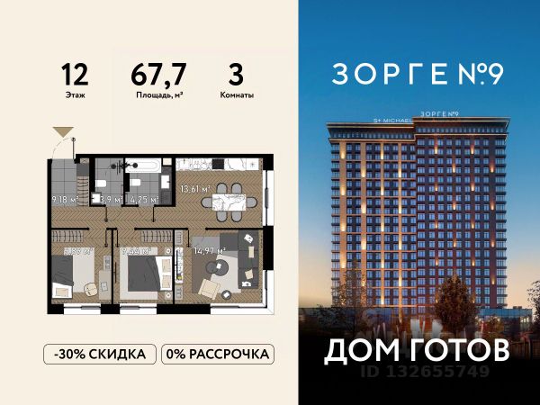 "Зорге 9" — готовые апартаменты бизнес-класса на Ходынке. 10 минут до Москва-Сити. Архитектура: 3 современных корпуса с фасадами в стиле архитектуры Нью-Йорка и с сервисами премиальных отелей, высотой до 23 этажа. Строгие линии, панорамные окна создают ощущение неподдельной роскоши и комфортной жизни в сердце мегаполиса. Проект награжден авторитетной премией European Property Awards. Резиденции: Свободная планировка, небольшая глубина этажа, огромные панорамные окна в пол до 3,6 м и высота потолков до от 3,3 до 4,3 м позволяют реализовать самые смелые концептуальные идеи и создать идеальный интерьер с учетом всех пожеланий. Вдохновляющие виды на город украсят ваш апартамент лучше любой картины. Есть возможность приобретения дизайн-проекта и полной меблировки апартаментов от партнеров девелопера. Расположение: 3 мин. пешком до парка Березовая роща 10 мин. пешком до Ходынского поля 10 мин. до ТЦ Авиапарк 30 минут до Шереметьево 10 мин до Москва-Сити или 1 станция до Москва-Сити 5 минут до ТТК 4 станции метро в шаговой доступности: 6 мин м. Полежаевская (фиолетовая ветка) 7 мин МЦК Зорге (МЦК) 7 мин м. Хорошевская (голубая ветка) 10 мин МЦК Хорошёво (МЦК) Благоустройство: Собственный парк 2 га с амфитеатром и поющими фонтанами. В парке высажено 136 деревьев и более 11 000 кустов и мелких растений из немецких питомников. Площадка для йоги и воркаут-зона со спортивными площадками. Теннисные столы и детский плейхаб Две башни Авторское гранд-лобби В лобби предусмотрена лаундж-зона, чайная с камином, комната для хранения велосипедов и колясок. Доступ по системе FACE ID. В отделке лобби и лифтовых холлов использован декоративный камень итальянского бренда Atlas Concorde Пентхаусы На верхнем уровне комплекса расположены роскошные просторные пентхаусы с высотой потолка до 4,2 метра и панорамными окнами до 3,6 метров, открывающими великолепные виды на столицу. Пентхаусы с выходами на собственные приватные террасы на кровле, площадью от 150 кв. м являются жильем high-уровня, демонстрирующим высокий статус владельца.