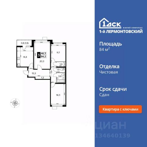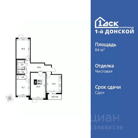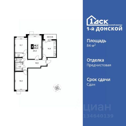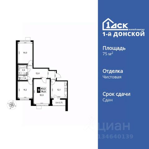 Продаётся 3-к квартира номер 198 общей площадью 76.8 кв.м. на 6-м этаже 24 этажного дома. Чистовая отделка. Дом сдан.