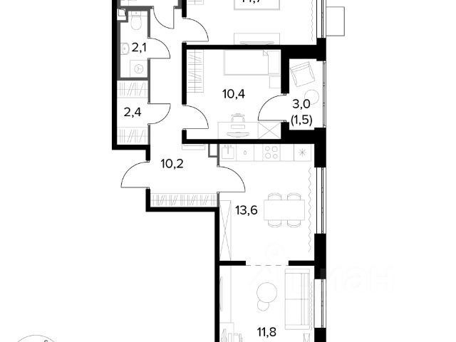 Квартира с кухней-гостиной и тремя спальнями в "Первом квартале". Особенности планировки: окна на две стороны, второй санузел, окна в пол, без отделки, выгода 30%, тёплая лоджия, разнесённые спальни, терраса, балкон, терраса на крыше. квартиры в нашей базе: ПК5-ГП5-1-1.8.4.
