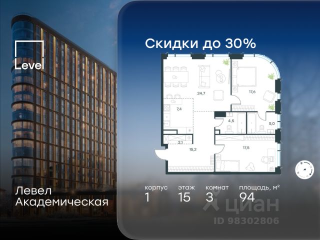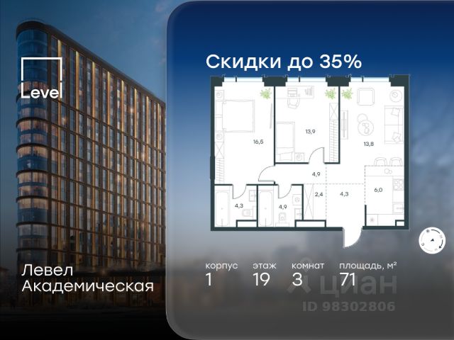 Цена указана с учётом скидки при 100%-й оплате, несубсидированной ипотеке, рассрочке (кроме программы "Рассрочка 0%"). В Академическом районе продаётся 3-комнатная квартира площадью 101.10 кв.м без отделки. Квартира расположена на 19-м этаже 19-этажного жилого комплекса бизнес-класса Левел Академическая (компания Level Group). Площади помещений определены кадастровым инженером по результатам обмеров. Отличная транспортная доступность: - 1 мин. пешком до станции метро "Академическая"; - 4 мин. на автомобиле до ТТК; - 8 мин. на автомобиле до Садового кольца; - 13 мин. на автомобиле до Кремля. Продуманный архитектурный проект: - современная архитектура от бюро UNK project; - высокие потолки в квартирах до 6,62 м; - окна в пол высотой 2,5-2,68 м с панорамным видом на МГУ, Москва-Сити и другие доминанты Москвы; - квартиры с моллированным остеклением - радиусные окна открывают увеличенный угол обзора; - более 20 вариантов планировочных решений; - уникальные квартиры с собственным патио и возможностью обустройства дровяного камина; - квартиры сдаются без отделки, что открывает свободу для создания интерьера по своему вкусу. Расположение: Камерный проект из 1 корпуса расположен тихом зеленом районе Москвы, в непосредственной близости к центру города. В округе построено 80 детских садов, 50 школ и 30 вузов, 7 из которых входят в топ100 вузов России: МГУ, МГИМО, РАНХиГС, МИСИС, РУДН, РЭУ им. Плеханова и РГУ нефти и газа им. Губкина. Этот район буквально утопает в зелени парков, начиная с уютного Академического в 6 минутах пешком и заканчивая одним из крупнейших в городе парком 50-летия Октября (12 минут на автомобиле). Общая площадь природных объектов в радиусе 2-6 км от дома - 476,5 га. Внутренняя инфраструктура: На территории жилого комплекса Левел Академическая откроется собственный торговый центр, а для отдыха жителей будут созданы общественные пространства: комфортное лобби с дизайнерской отделкой, окнами в пол и потолками высотой 4,5 м, а также две благоустроенные зоны - территория по периметру здания и пространство на стилобате. Во дворе на стилобате предусмотрены детская и спортивная площадки, коворкинг и лаунж-зона на открытом воздухе. Стилобат украсят скульптуры животных - жирафа, зайца и волка, которые станут ярким акцентом внутреннего двора жилого комплекса Левел Академическая, подчеркивая близость к музею Дарвина. Процент озеленения территории - 58%. Технологии и безопасность: Жителей жилого комплекса Левел Академическая не коснется ежегодное отключение горячей воды благодаря собственным центральным водонагревателям. Безопасность гарантирует круглосуточная охрана, безлимитный Wi-Fi, круглосуточное видеонаблюдение. Удобное перемещение внутри комплекса будут обеспечивать 5 лифтов с доступом в паркинг с жилых этажей.