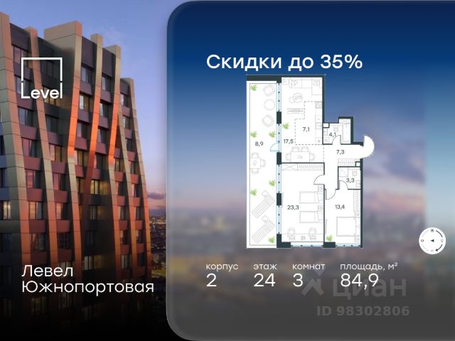 Цена указана с учётом скидки при 100%-й оплате, несубсидированной ипотеке, рассрочке (кроме программы "Рассрочка 0%"). В северной части района Печатники продается 3-комнатная квартира площадью 65.40 кв.м без отделки. Квартира расположена на 5 этаже 16-этажного корпуса 11 в жилом комплексе комфорт-класса Левел Южнопортовая (компания Level Group/Левел групп). Отличная транспортная доступность: - 10 мин. пешком до станции метро "Кожуховская"; - 20 мин. пешком до станции МЦК "Дубровка"; - 3 мин. на авто до ТТК; - 13 мин. на авто до Садового кольца; - 15 мин. на авто до Бульварного кольца. Продуманный архитектурный проект: - авторская архитектура от бюро СПИЧ; - уникальные виды на реку, парки и достопримечательности города; - высота потолков в квартирах до 6 м; - окна высотой до 1,87 м с высоким коэффициентом сопротивления теплоотдаче. Расположение: Жилой комплекс Левел Южнопортовая строится в северной части района Печатники - самой приближенной к центру. Здесь будет сформирован новый район "Южный порт", где построят крупный жилой и общественно-деловой центр, аналогичный Москва-Сити. В течение 10-12 лет в этом месте появятся не только жилые дома, но и развитая инфраструктура для жизни и работы. А еще совсем рядом находится набережная Москвы-реки, где планируется построить причалы для речных трамвайчиков и канатную дорогу. Уже сейчас вокруг жилого комплекса работают десятки магазинов и торговых центров, рядом расположено 6 парков, среди которых музей-заповедник "Коломенское". В 10 минутах пешком - 2 муниципальных и 2 частных детских сада, 7 общеобразовательных школ. Внутренняя инфраструктура: Для отдыха жителей в каждом корпусе предусмотрено лобби, оснащенное местами для отдыха, гостевыми санузлами и лапомойками, а в отдельных корпусах - камином. За счёт больших окон и высоких потолков пространства будут наполнены воздухом и светом. На первых этажах жилого комплекса откроются магазины, салоны красоты, фитнес-центр. Для детей строятся собственные детский сад и школа. Благоустройство: Внутренний двор комплекса разработан совместно с бюро GAFA. Основная идея - создать аналог Центрального парка в Нью-Йорке, гармонично сочетая высотные здания и большое изолированное парковое пространство. Вся площадь двора-парка будет огорожена и составит более 2 га, из которых 45% - озеленение. Одним из самых важных ландшафтных элементов здесь станет небольшая речка, наполняющаяся во время дождя. Вокруг неё появится сеть из островов, внутри которых расположатся тематические зоны спорта и отдыха. Технологии и инженерия: - автоматическая передача в управляющую компанию показаний квартирных счётчиков; - телефонная связь, телевидение и интернет на базе оптической мультисервисной сети; - гостевой вайфай в лобби и на территории двора; - единый ключ доступа для входа на территорию комплекса.