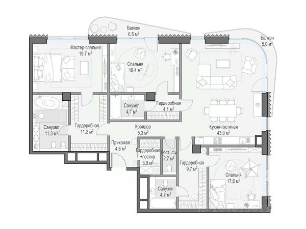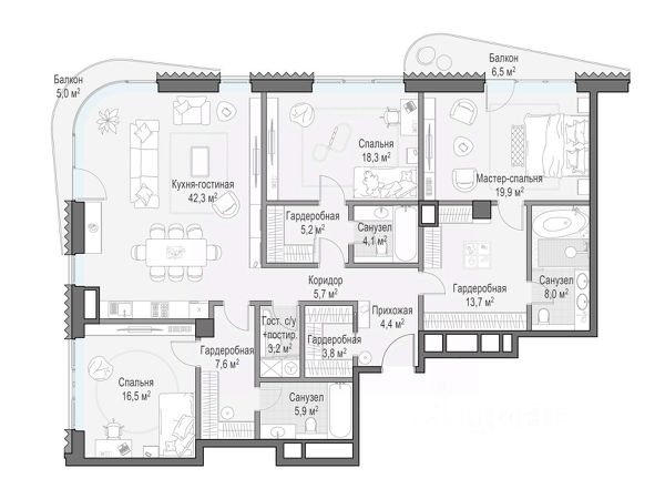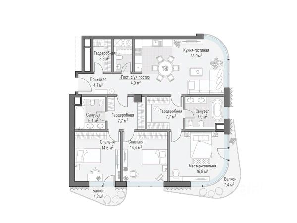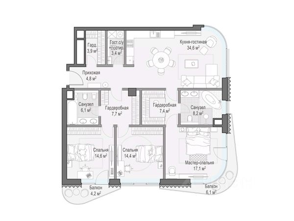 Квартира общей площадью 254,1 кв. м расположена на 4-м этаже жилого дома "Никитский 6". Из окон открывается вид на Никитский бульвар, Арбат, Дом-музей им. Н.В. Гоголя и Центральный Дом журналиста. Планировочное решение включает панорамную кухню-гостиную, 3 мастер-спальни с личными ванными и гардеробными комнатами и сервисные помещения. Во всех квартирах предусмотрена высококачественная авторская отделка с кухонными модулями, бытовой техникой и полностью оборудованными ванными комнатами. В интерьере предложены природные оттенки и натуральные премиальные материалы: дерево, различные породы камня, элементы металла. Выполнена интеграция ультрасовременных инженерных систем с элементами управления smart home и multiroom. "Никитский 6" расположен в одном из культовых районов столицы — на Арбате, на пересечении Никитского бульвара и улицы Воздвиженка. В пешей доступности от дома находятся всемирно известные культурные достопримечательности, образовательные учреждения, зеленые бульвары для прогулок, модные рестораны и бутики Никитской улицы и всего в пяти минутах ходьбы Александровский сад. Для дополнительного комфорта резидентов "Никитский 6" предусмотрена клубная инфраструктура: просторное комфортабельное лобби, зал для частных занятий йогой и пилатесом, библиотека и пространство для деловых встреч. На трех подземных уровнях дома расположен просторный паркинг с увеличенными габаритами машино-мест, скоростными зарядками для электромобилей, storage-rooms и сервисными помещениями для персонала.