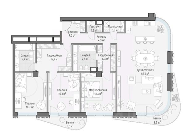 Квартира общей площадью 254,1 кв. м расположена на 4-м этаже жилого дома "Никитский 6". Из окон открывается вид на Никитский бульвар, Арбат, Дом-музей им. Н.В. Гоголя и Центральный Дом журналиста. Планировочное решение включает панорамную кухню-гостиную, 3 мастер-спальни с личными ванными и гардеробными комнатами и сервисные помещения. Во всех квартирах предусмотрена высококачественная авторская отделка с кухонными модулями, бытовой техникой и полностью оборудованными ванными комнатами. В интерьере предложены природные оттенки и натуральные премиальные материалы: дерево, различные породы камня, элементы металла. Выполнена интеграция ультрасовременных инженерных систем с элементами управления smart home и multiroom. "Никитский 6" расположен в одном из культовых районов столицы — на Арбате, на пересечении Никитского бульвара и улицы Воздвиженка. В пешей доступности от дома находятся всемирно известные культурные достопримечательности, образовательные учреждения, зеленые бульвары для прогулок, модные рестораны и бутики Никитской улицы и всего в пяти минутах ходьбы Александровский сад. Для дополнительного комфорта резидентов "Никитский 6" предусмотрена клубная инфраструктура: просторное комфортабельное лобби, зал для частных занятий йогой и пилатесом, библиотека и пространство для деловых встреч. На трех подземных уровнях дома расположен просторный паркинг с увеличенными габаритами машино-мест, скоростными зарядками для электромобилей, storage-rooms и сервисными помещениями для персонала.