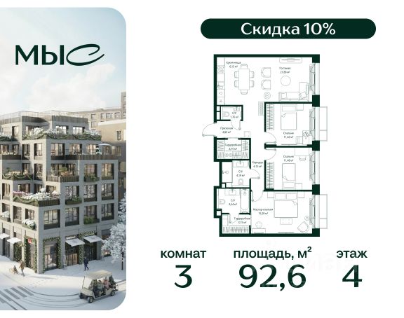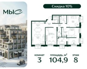 Прямая продажа от застройщика. Продаётся 3-комнатная квартира общей площадью 104.93 м² без отделки в премиальном жилом комплексе "МЫС" на 8-м этаже 12 этажного дома. Квартира расположена в корпусе "Сибирь". Проект МЫС — это, прежде всего, идеальное место для семей. В рамках проекта построят государственную школу, два детских сада и дворец спорта площадью 20 000 м2 с термальным комплексом, выплывным бассейном, фитнес-залом, теннисными, сквош и падел кортами и секциями для детей. На территории площадью, сравнимой с тремя парками Зарядье, появятся кафе и рестораны, пруд с набережной, спортивные и детские площадки, скейт-парк, лыжные и веломаршруты. Расположение: - 2 минуты до скоростной трассы М1 и Минского шоссе; - 10 минут до МКАД; - 15 минут до МЦД Лесной Городок - 20 минут до делового центра "Москва-Сити"; - 28 минут до аэропорта "Внуково". Благоустройство: - велосипедные и лыжные маршруты; - собственная набережная и парк; - лаунж-зоны в окружении природы; - беседки у очага; - дворец спорта площадью 20 000 м²; - термальный комплекс с тремя бассейнами; - 4 теннисных и падел-корта; - 6 сквош-кортов; - многофункциональный спортзал; - скейт-парк; - просторная площадь для прогулок с фонтаном; - детский клуб с творческими секциями; - гастро-доминанта; - кафе у пруда, рестораны, ритейл. Окружение - соседство с лесным фондом; - школа на 1250 мест и 2 детских сада на 350 и 255 мест; - Дубковский и Подушкинский леса, парк "Рассказовка", Мещерский парк. Действуют специальные условия при 100% оплате, подробности уточняйте у менеджера в офисе продаж.